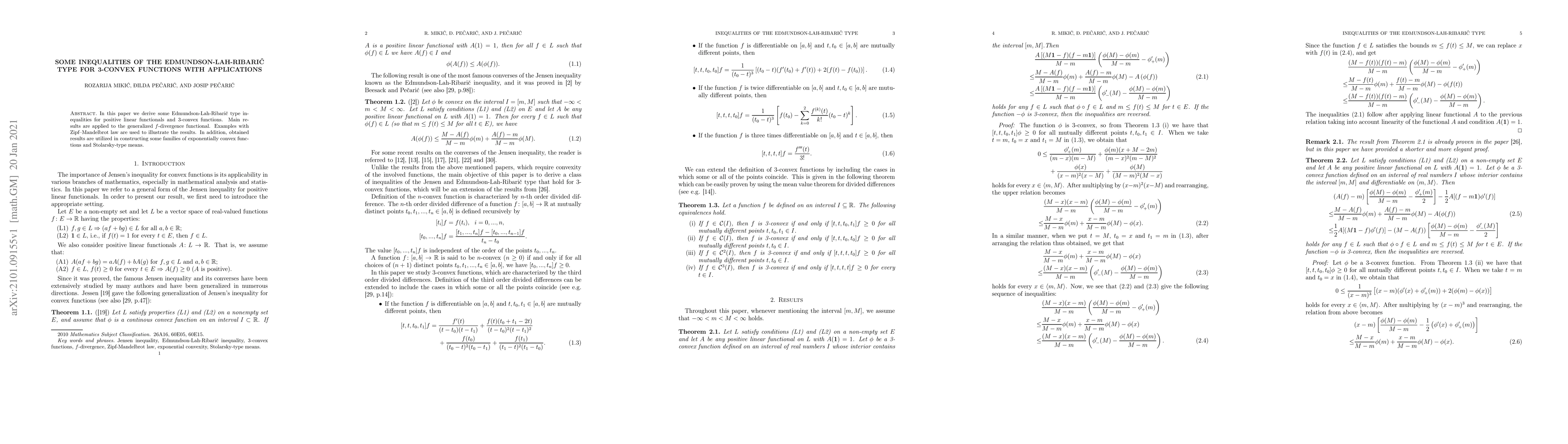 In this paper we derive some Edmundson-Lah-Ribari\v{c} type inequalities for positive linear functionals and 3-convex functions. Main results are applied to the generalized f-divergence functional. Examples with Zipf Mandelbrot law are used to illustrate the results. In addition, obtained results are utilized in constructing some families of exponentially convex functions and Stolarsky-type means.