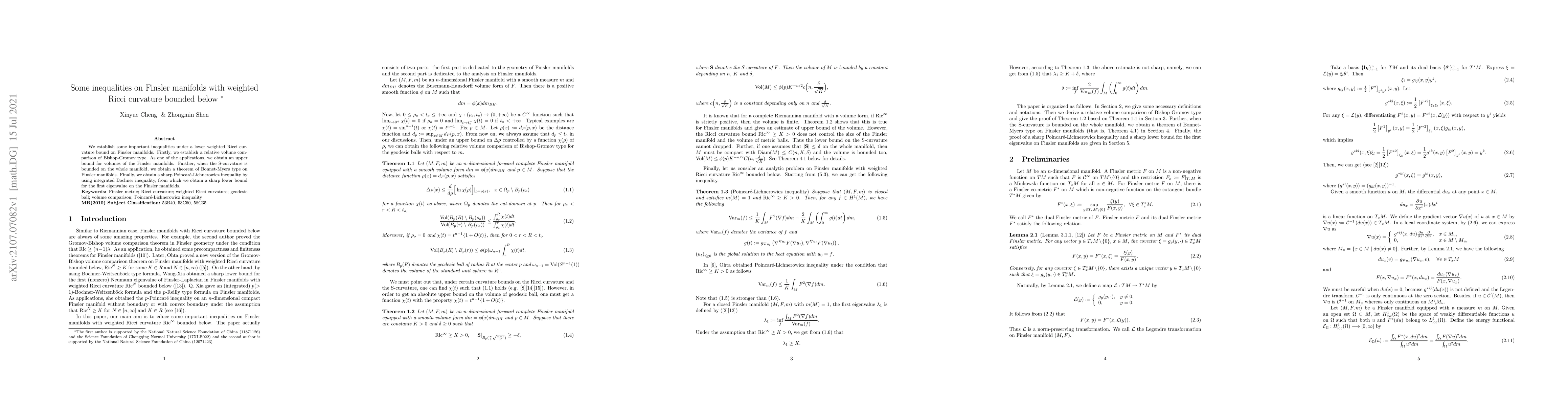 This paper establishes key inequalities on Finsler manifolds with a lower weighted Ricci curvature bound, including a Bishop-Gromov type relative volume comparison, an upper volume bound, a Bonnet-Myers theorem, and a sharp Poincaré-Lichnerowicz inequality leading to a lower bound for the first eigenvalue.