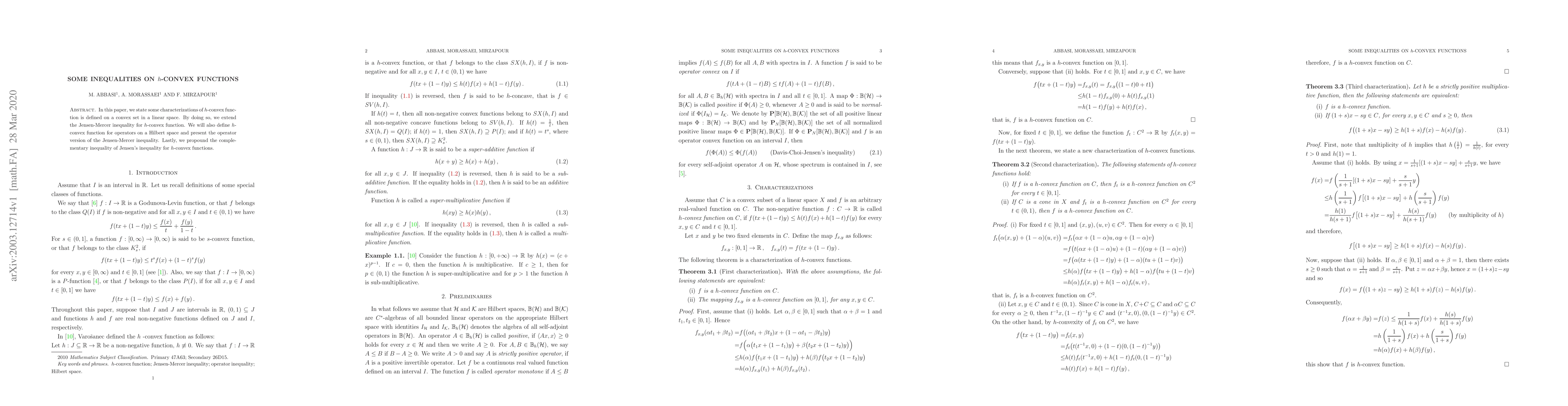 This paper characterizes $h$-convex functions on convex sets in linear spaces, extends the Jensen-Mercer inequality for these functions, and presents an operator version in Hilbert spaces. It also introduces a complementary inequality of Jensen's inequality for $h$-convex functions.