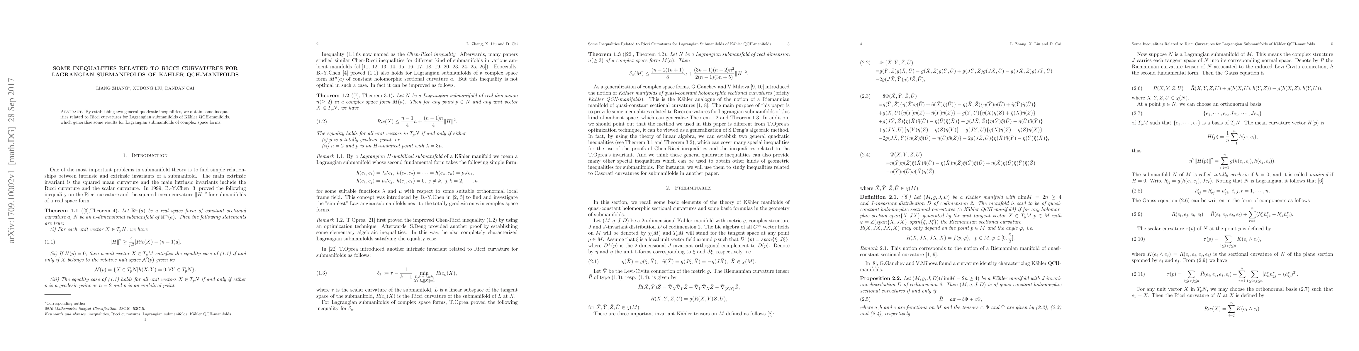 By establishing two general quadratic inequalities, we obtain some inequalities related to Ricci curvatures for Lagrangian submanifolds of K$\ddot{\mathrm{a}}$hler QCH-manifolds, which generalize some results for Lagrangian submanifolds of complex space forms.