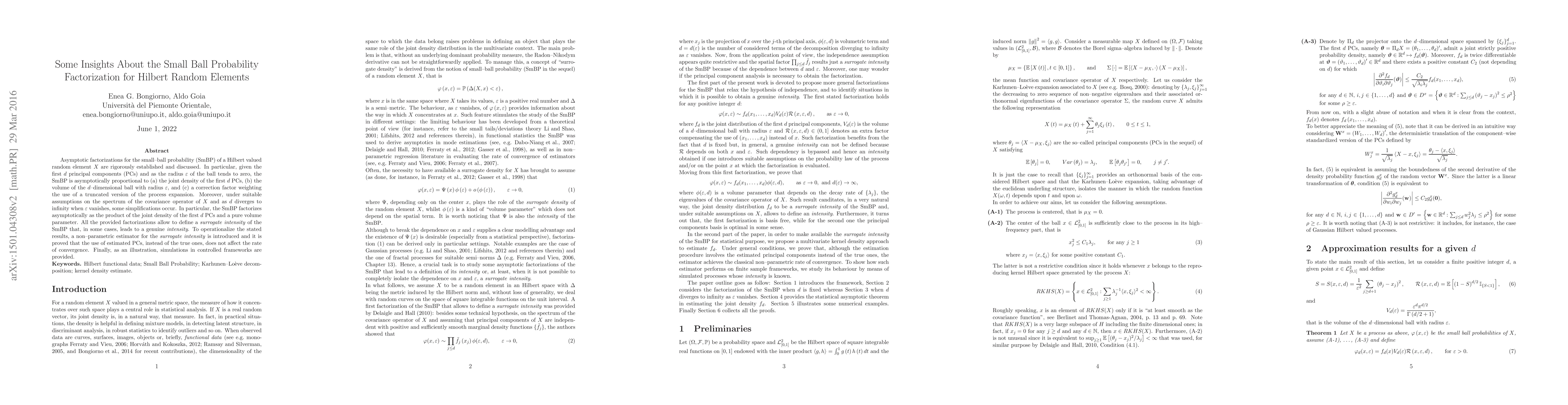 A research paper establishes asymptotic factorizations for the small-ball probability of a Hilbert-valued random element, showing it's proportional to joint density of principal components and volume parameters.
