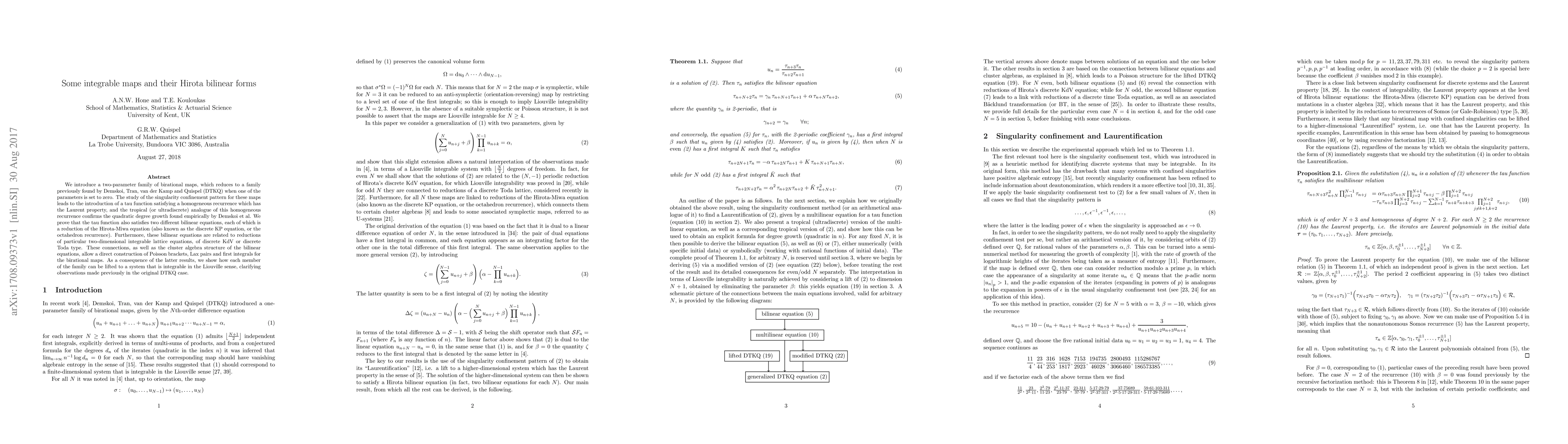 We introduce a two-parameter family of birational maps, which reduces to a family previously found by Demskoi, Tran, van der Kamp and Quispel (DTKQ) when one of the parameters is set to zero. The study of the singularity confinement pattern for these maps leads to the introduction of a tau function satisfying a homogeneous recurrence which has the Laurent property, and the tropical (or ultradiscrete) analogue of this homogeneous recurrence confirms the quadratic degree growth found empirically by Demskoi et al. We prove that the tau function also satisfies two different bilinear equations, each of which is a reduction of the Hirota-Miwa equation (also known as the discrete KP equation, or the octahedron recurrence). Furthermore, these bilinear equations are related to reductions of particular two-dimensional integrable lattice equations, of discrete KdV or discrete Toda type. These connections, as well as the cluster algebra structure of the bilinear equations, allow a direct construction of Poisson brackets, Lax pairs and first integrals for the birational maps. As a consequence of the latter results, we show how each member of the family can be lifted to a system that is integrable in the Liouville sense, clarifying observations made previously in the original DTKQ case.