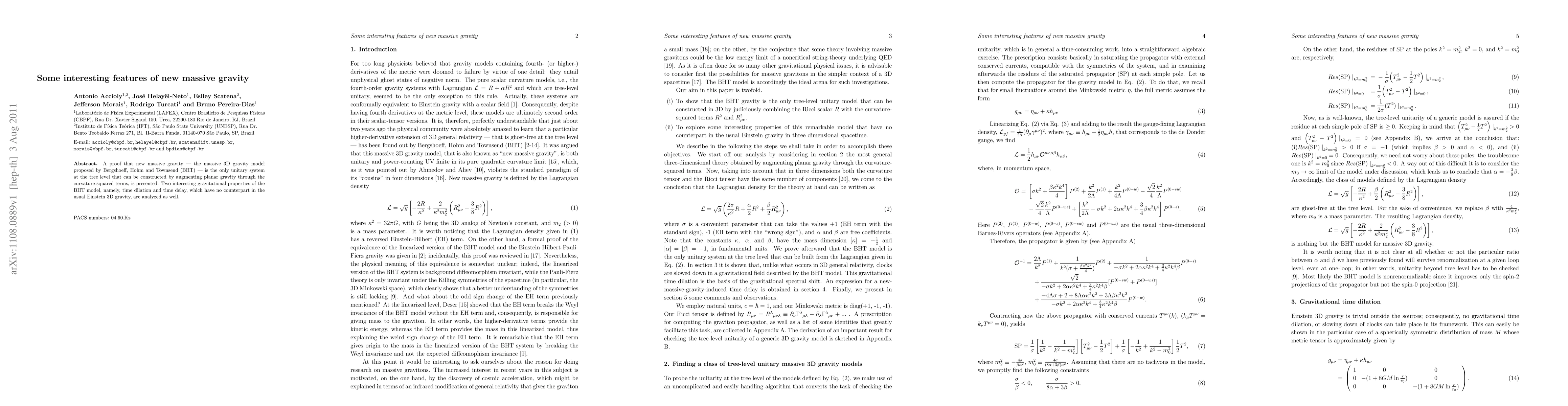 This paper proves that new massive gravity is the sole unitary model at tree level extending 3D gravity via curvature-squared terms. It also explores unique gravitational features in the BHT model, such as time dilation and time delay, absent in standard Einstein 3D gravity.