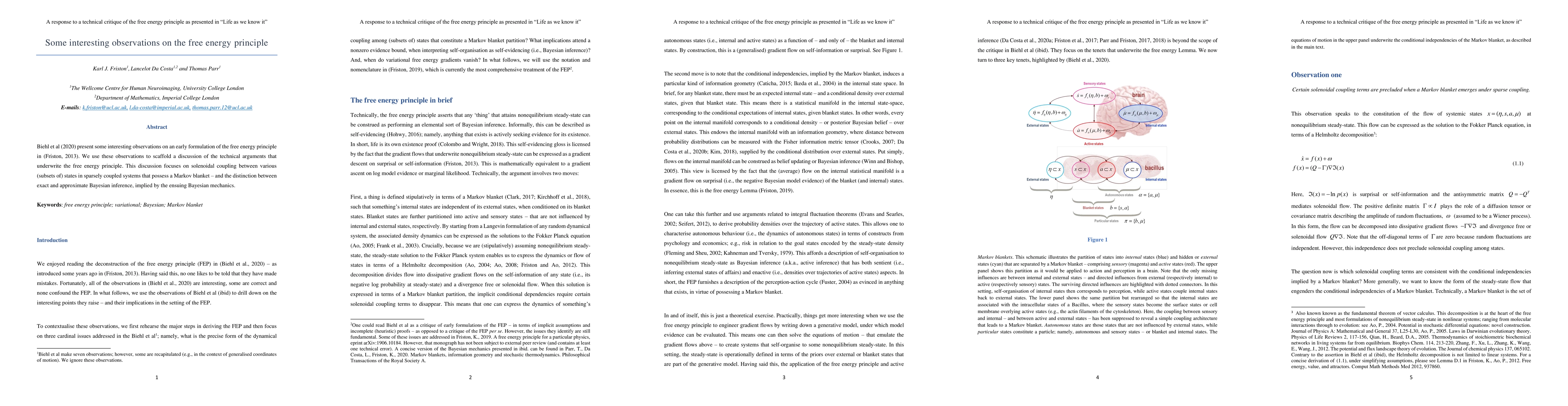 Biehl et al. (2020) explore the foundational aspects of the free energy principle, emphasizing the technical underpinnings involving solenoidal coupling in sparsely coupled systems with Markov blankets, and the distinction between exact and approximate Bayesian inference.