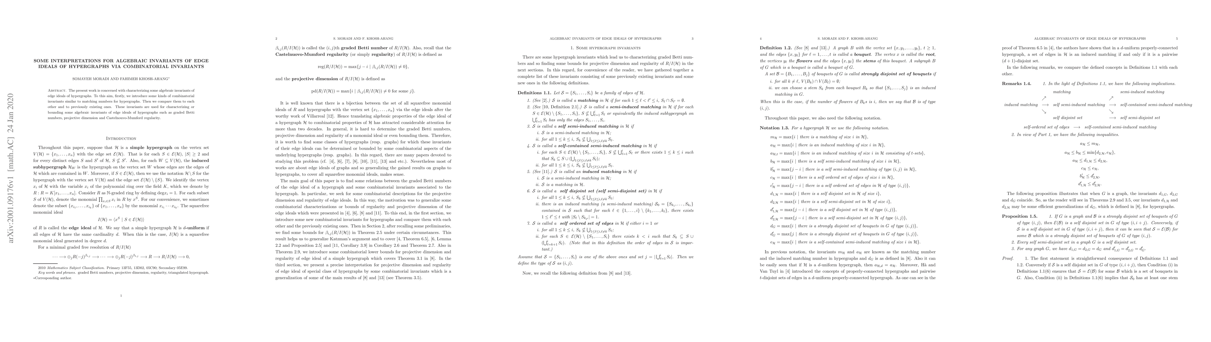 This paper characterizes algebraic invariants of edge ideals in hypergraphs by introducing new combinatorial invariants akin to matching numbers. It compares these new invariants with existing ones and uses them to determine or bound algebraic properties like graded Betti numbers, projective dimension, and Castelnuovo-Mumford regularity.