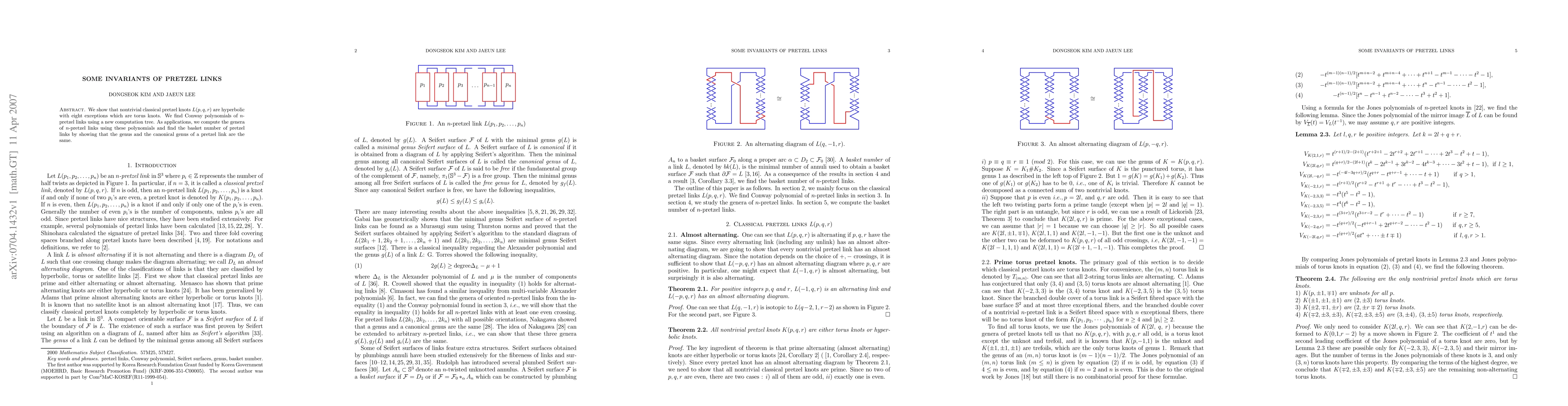 We show that nontrivial classical pretzel knots L(p,q,r) are hyperbolic with eight exceptions which are torus knots. We find Conway polynomials of n-pretzel links using a new computation tree. As applications, we compute the genera of n-pretzel links using these polynomials and find the basket number of pretzel links by showing that the genus and the canonical genus of a pretzel link are the same.