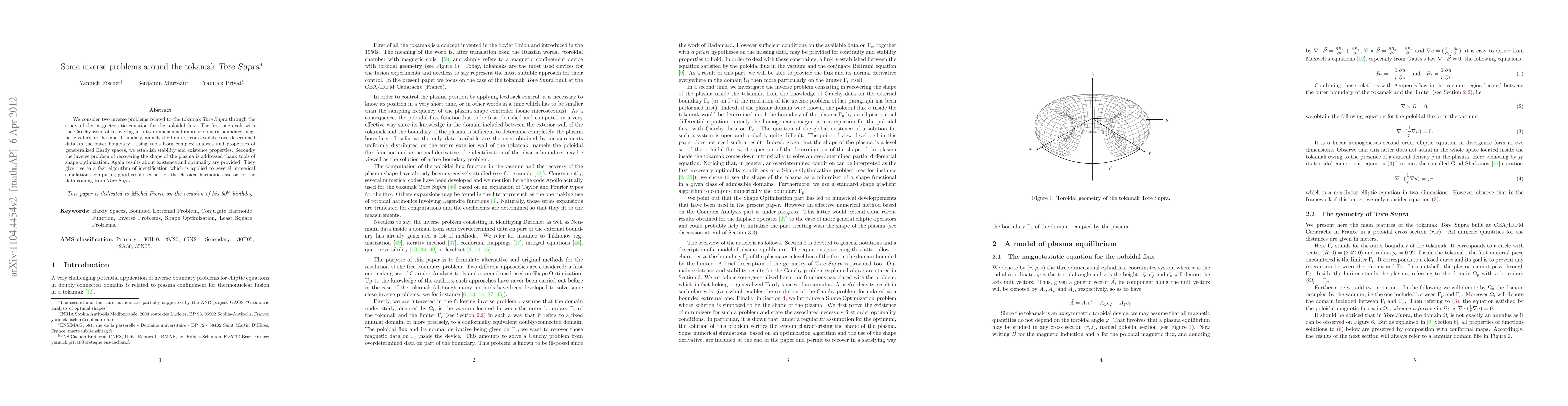 This research investigates two inverse problems concerning the tokamak Tore Supra, focusing on magnetic field recovery and plasma shape identification using complex analysis and shape optimization techniques. It presents stable solutions, existence proofs, and a fast identification algorithm, demonstrated through numerical simulations with Tore Supra data.