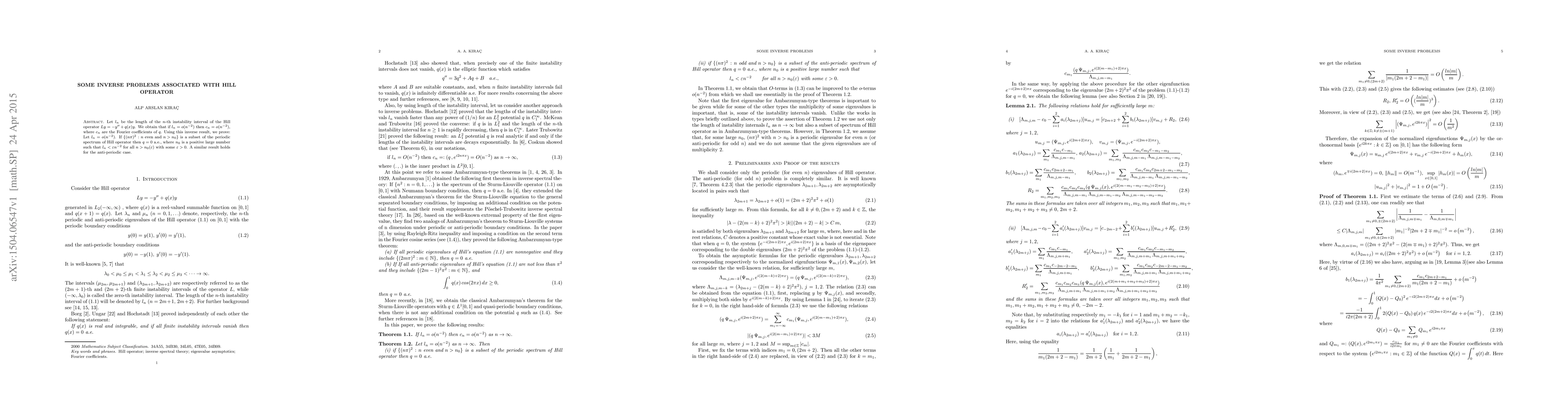 Let $l_{n}$ be the length of the $n$-th instability interval of the Hill operator $Ly=-y^{\prime\prime}+q(x)y$. We obtain that if $l_{n}=o(n^{-2})$ then $c_{n}=o(n^{-2})$, where $c_{n}$ are the Fourier coefficients of $q$. Using this inverse result, we prove: Let $l_{n}=o(n^{-2})$. If $\{(n\pi)^{2}: \textrm{$n$ even and $n>n_{0}$}\}$ is a subset of the periodic spectrum of Hill operator then $q=0$ a.e., where $n_{0}$ is a positive large number such that $l_{n}<\varepsilon n^{-2}$ for all $n>n_{0}(\varepsilon)$ with some $\varepsilon>0$. A similar result holds for the anti-periodic case.