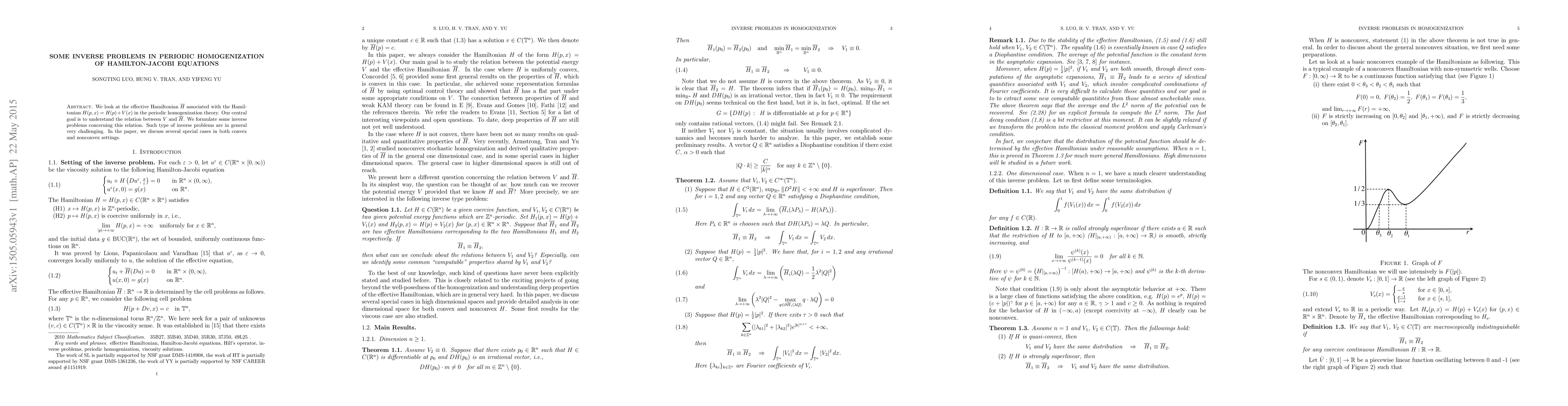 This paper investigates the relationship between a periodic potential V(x) and its effective Hamiltonian ar H in homogenization of Hamilton-Jacobi equations, formulating special cases to tackle challenging inverse problems.