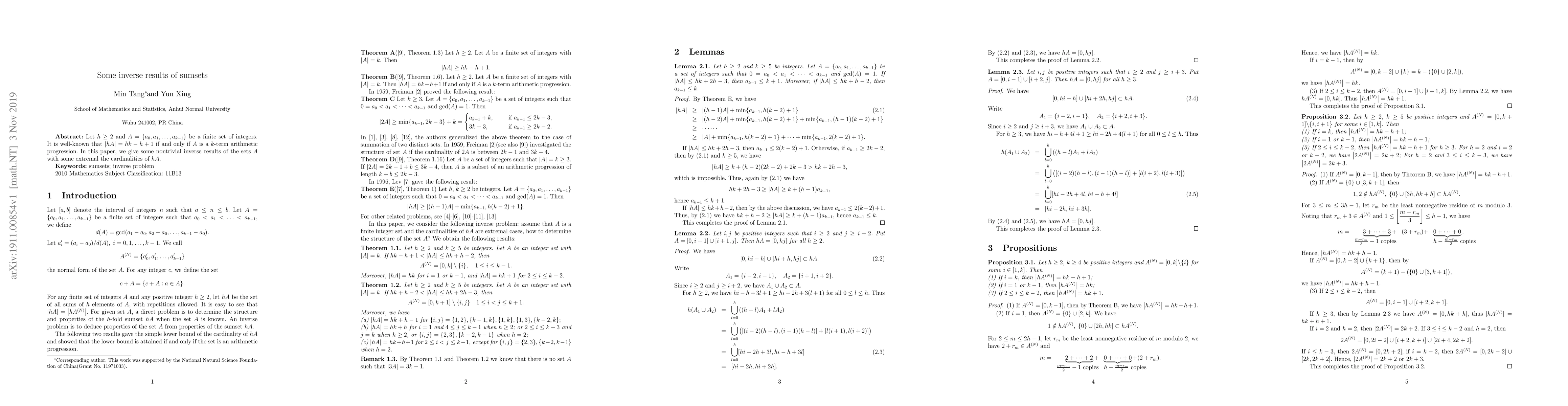 Let $h\geq 2$ and $A=\{a_0,a_1,\ldots,a_{k-1}\}$ be a finite set of integers. It is well-known that $\left|hA\right|=hk-h+1$ if and only if $A$ is a $k$-term arithmetic progression. In this paper, we give some nontrivial inverse results of the sets $A$ with some extrema the cardinalities of $hA$.