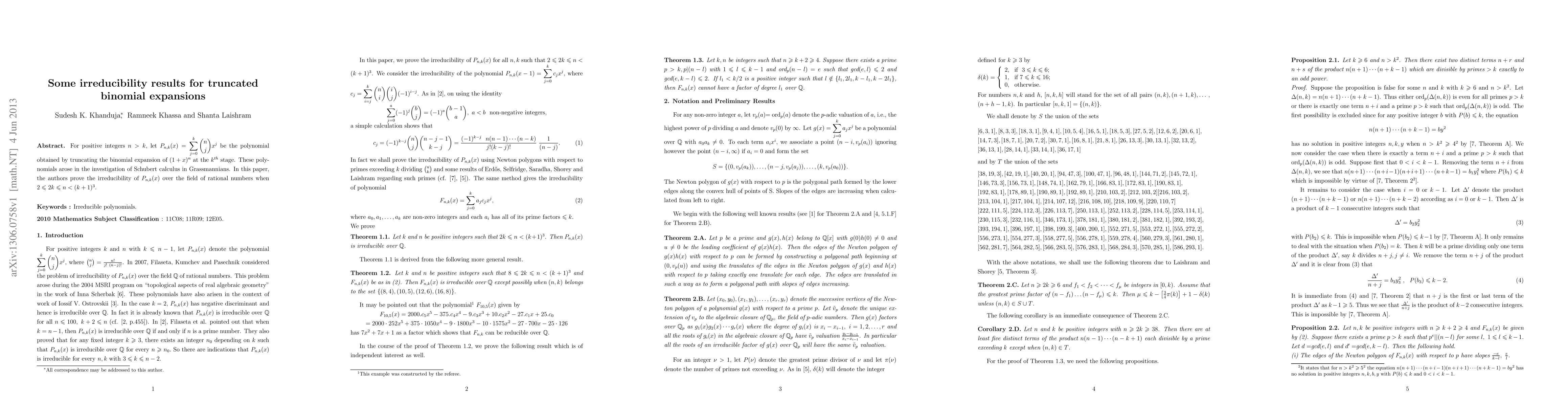 For positive integers $n>k$, let $P_{n,k}(x)=\displaystyle\sum_{j=0}^k \binom{n}{j}x^j $ be the polynomial obtained by truncating the binomial expansion of $(1+x)^n$ at the $k^{th}$ stage. These polynomials arose in the investigation of Schubert calculus in Grassmannians. In this paper, the authors prove the irreducibility of $P_{n,k}(x)$ over the field of rational numbers when $2\leqslant 2k \leqslant n<(k+1)^3$.