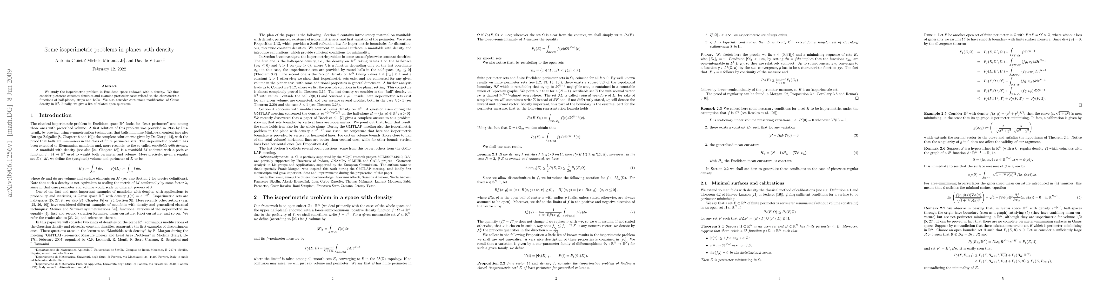 We study the isoperimetric problem in Euclidean space endowed with a density. We first consider piecewise constant densities and examine particular cases related to the characteristic functions of half-planes, strips and balls. We also consider continuous modification of Gauss density in $\R^2$. Finally, we give a list of related open questions.