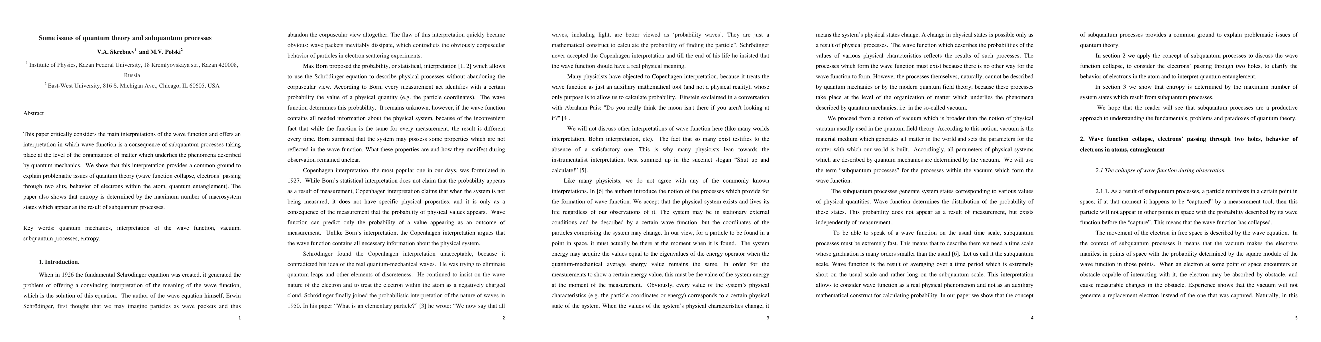 This paper critically considers the main interpretations of the wave function and offers an interpretation in which wave function is a consequence of subquantum processes taking place at the level of the organization of matter which underlies the phenomena described by quantum mechanics. We show that this interpretation provides a common ground to explain problematic issues of quantum theory (wave function collapse, electrons passing through two slits, behavior of electrons within the atom, quantum entanglement). The paper also shows that entropy is determined by the maximum number of macrosystem states which appear as the result of subquantum processes.