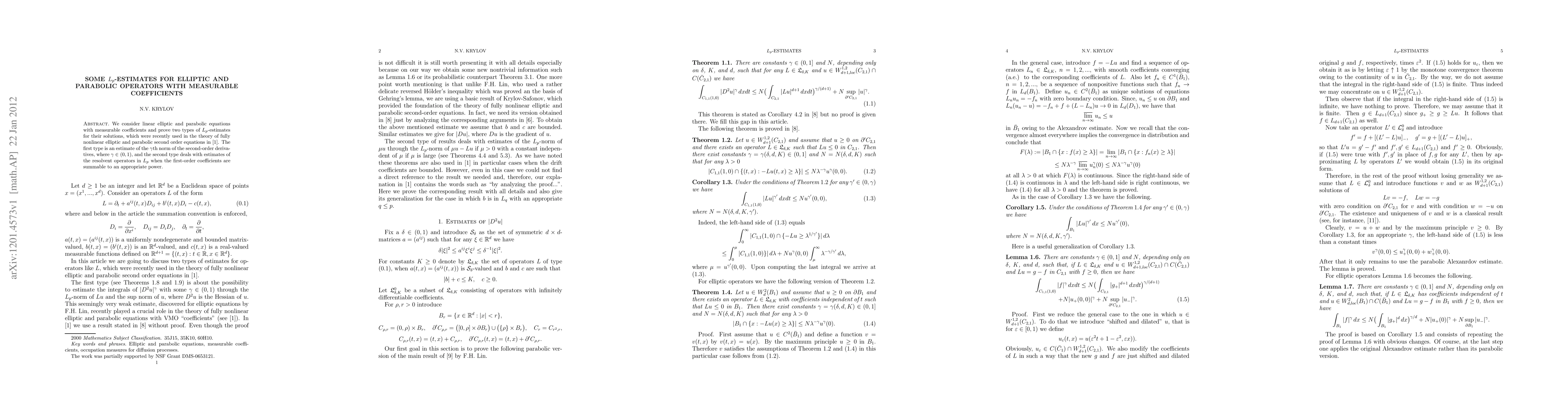 Title: Some $L_{p}$-estimates for elliptic and parabolic operators with measurable coefficients Summary: The paper proves $L_{p}$-estimates for solutions of elliptic and parabolic equations with measurable coefficients, including $\gamma$-norm estimates of second-order derivatives and resolvent operator estimates in $L_{p}$.