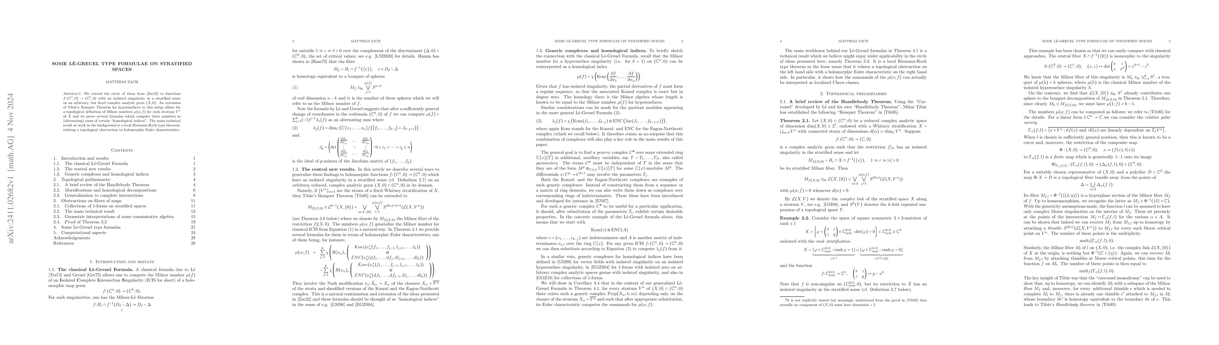 This paper extends ideas from previous work on hypersurfaces to functions with isolated singularities on stratified spaces, proving LĂŞ-Greuel type formulas for Milnor numbers using a topological definition and a local Riemann-Roch theorem. The Milnor numbers are computed as alternating sums of homological indices for each stratum.