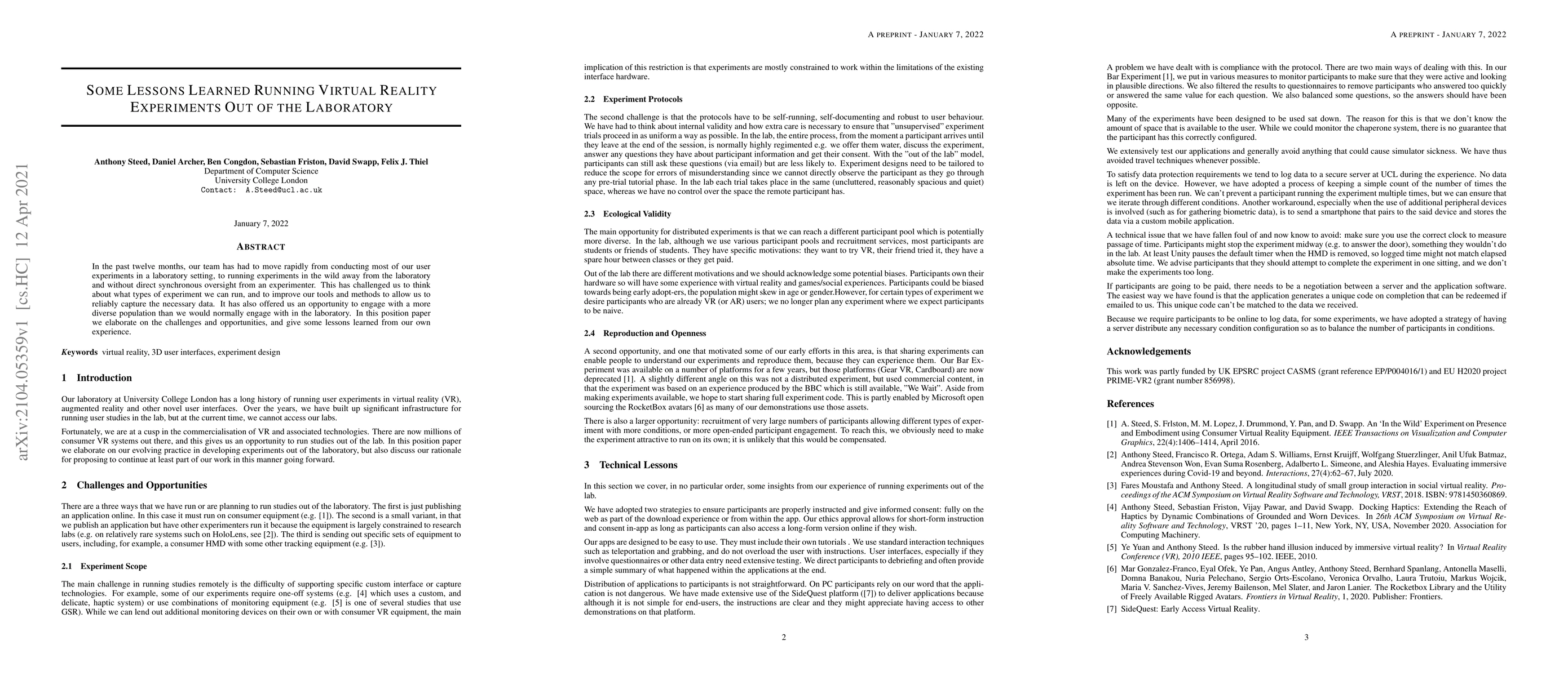 In the past twelve months, our team has had to move rapidly from conducting most of our user experiments in a laboratory setting, to running experiments in the wild away from the laboratory and without direct synchronous oversight from an experimenter. This has challenged us to think about what types of experiment we can run, and to improve our tools and methods to allow us to reliably capture the necessary data. It has also offered us an opportunity to engage with a more diverse population than we would normally engage with in the laboratory. In this position paper we elaborate on the challenges and opportunities, and give some lessons learned from our own experience.