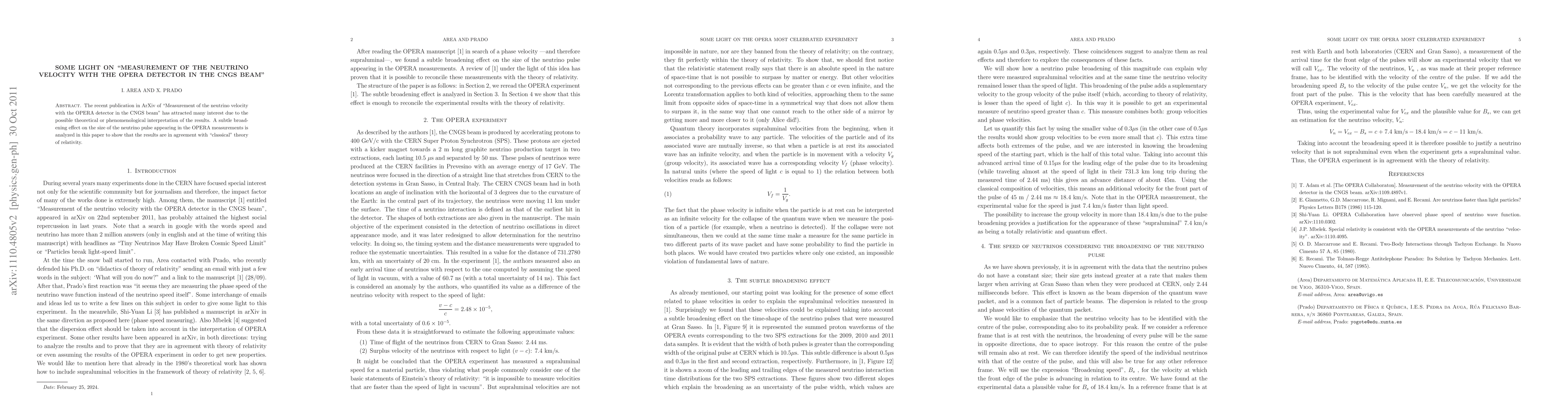 The recent publication in ArXiv of "Measurement of the neutrino velocity with the OPERA detector in the CNGS beam" has attracted many interest due to the possible theoretical or phenomenological interpretation of the results. A subtle broadening effect on the size of the neutrino pulse appearing in the OPERA measurements is analyzed in this paper to show that the results are in agreement with "classical" theory of relativity.