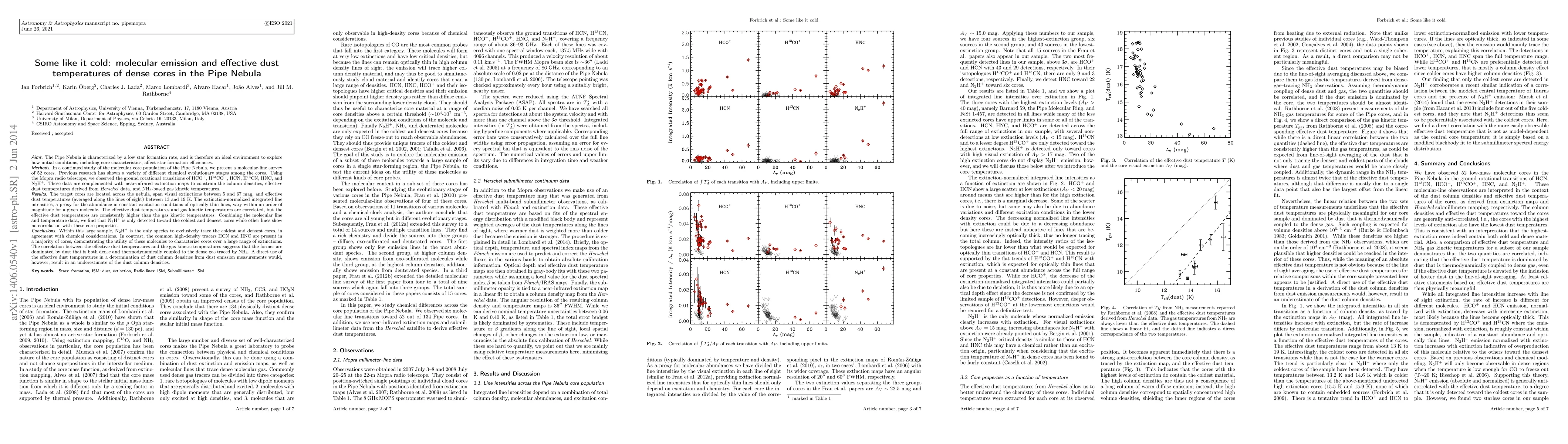 This study investigates the molecular emission and effective dust temperatures of 52 dense cores in the Pipe Nebula using the Mopra radio telescope. The research finds that N2H+ is detected only in the coldest and densest cores, while HCN and HNC are more widespread, indicating different chemical evolutionary stages. The effective dust temperatures are higher than gas kinetic temperatures, suggesting a strong coupling between dust and dense gas.