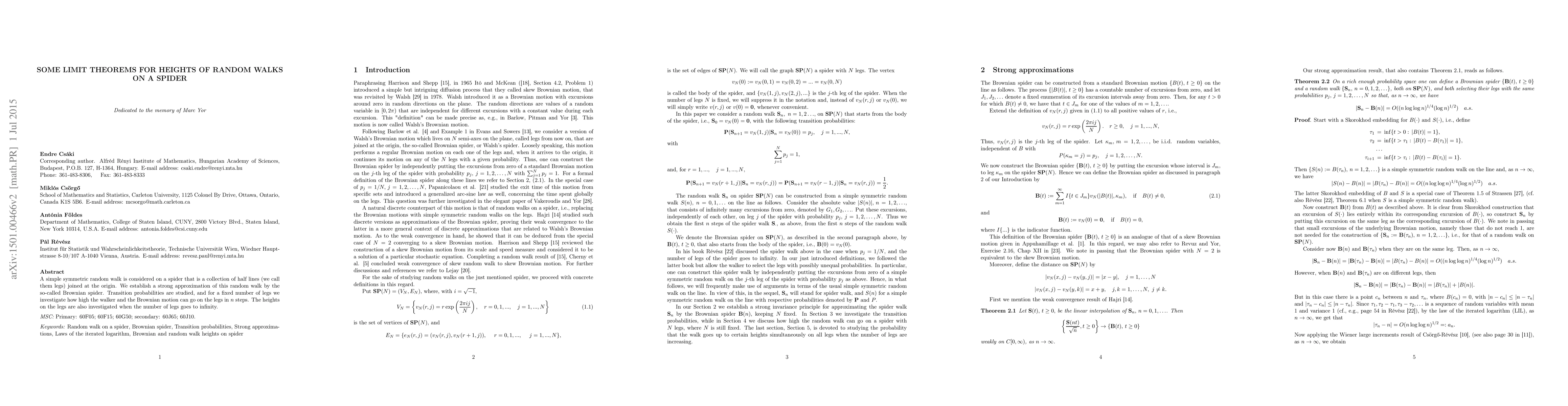A simple symmetric random walk is considered on a spider that is a collection of half lines (we call them legs) joined at the origin. We establish a strong approximation of this random walk by the so-called Brownian spider. Transition probabilities are studied, and for a fixed number of legs we investigate how high the walker can go on the legs in $n$ steps. The heights on the legs are also investigated when the number of legs goes to infinity.