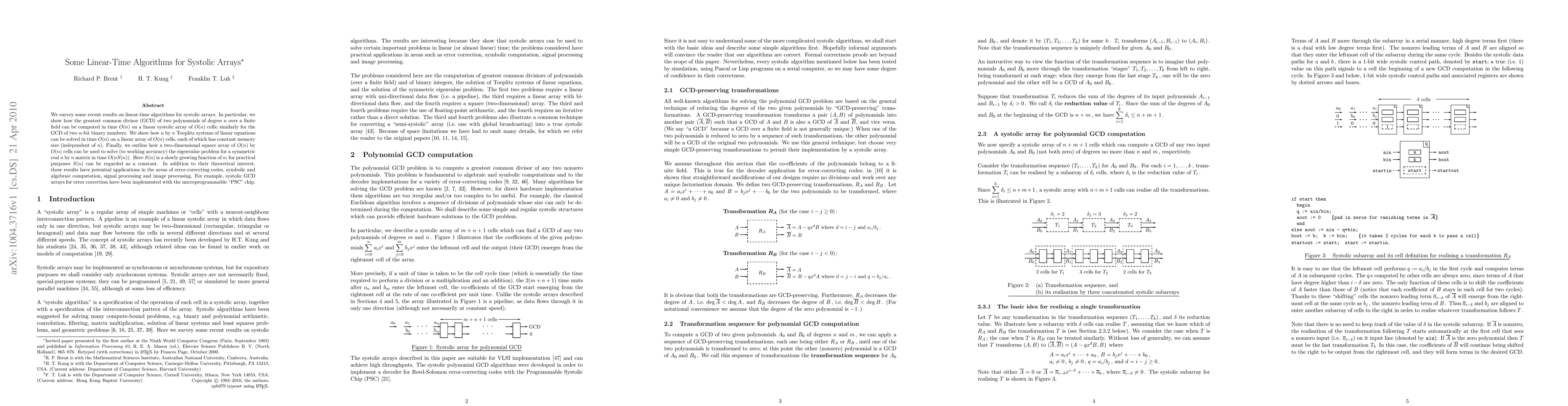 We survey some results on linear-time algorithms for systolic arrays. In particular, we show how the greatest common divisor (GCD) of two polynomials of degree n over a finite field can be computed in time O(n) on a linear systolic array of O(n) cells; similarly for the GCD of two n-bit binary numbers. We show how n * n Toeplitz systems of linear equations can be solved in time O(n) on a linear array of O(n) cells, each of which has constant memory size (independent of n). Finally, we outline how a two-dimensional square array of O(n)* O(n) cells can be used to solve (to working accuracy) the eigenvalue problem for a symmetric real n* n matrix in time O(nS(n)). Here S(n) is a slowly growing function of n; for practical purposes S(n) can be regarded as a constant. In addition to their theoretical interest, these results have potential applications in the areas of error-correcting codes, symbolic and algebraic computations, signal processing and image processing.