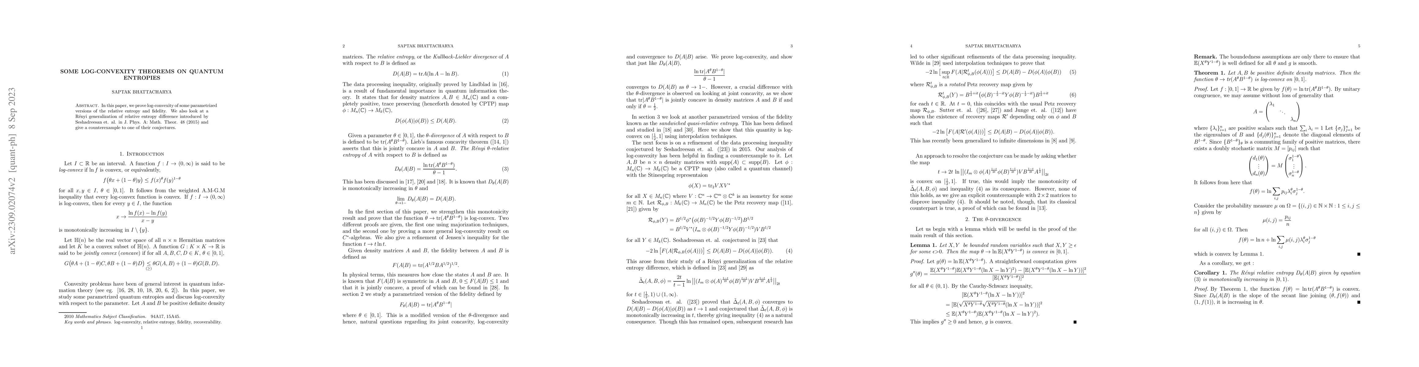 This paper proves log-convexity for certain parametrized versions of quantum relative entropy and fidelity. It also examines a Rényi generalization of relative entropy difference, refuting a conjecture from a previous study.