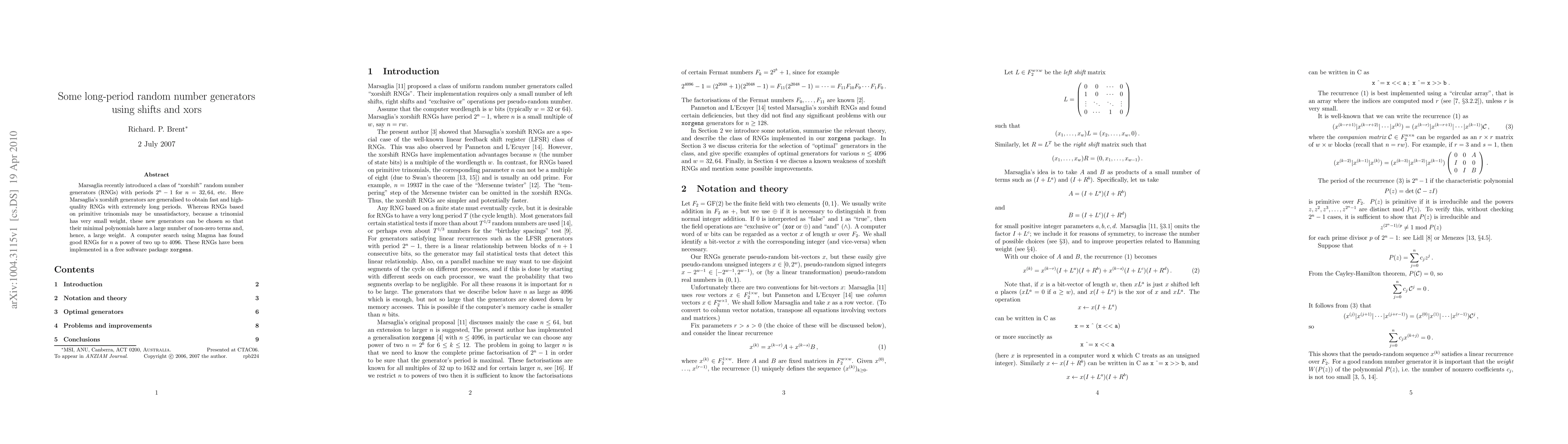 This paper generalizes Marsaglia's xorshift random number generators to achieve high-quality RNGs with extremely long periods by selecting minimal polynomials with large weights, contrasting with unsatisfactory trinomials. The authors implemented these generators in a free software package xorgens.