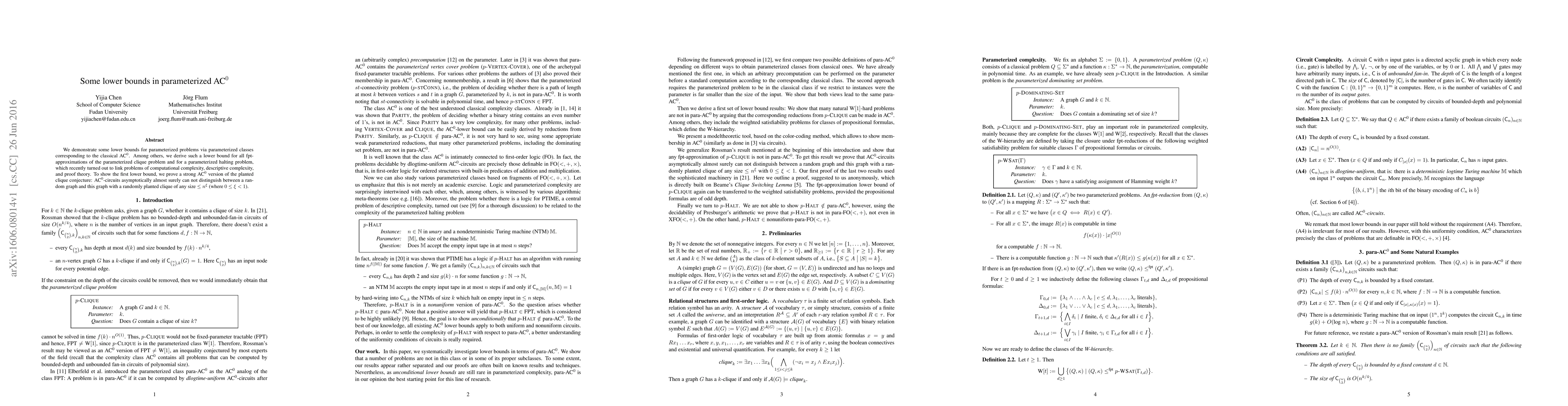 This paper establishes lower bounds for parameterized problems using ${\rm AC}^0$ circuit classes, specifically proving a strong version of the planted clique conjecture and deriving lower bounds for fpt-approximations of the parameterized clique problem and a parameterized halting problem. These results link computational complexity, descriptive complexity, and proof theory.