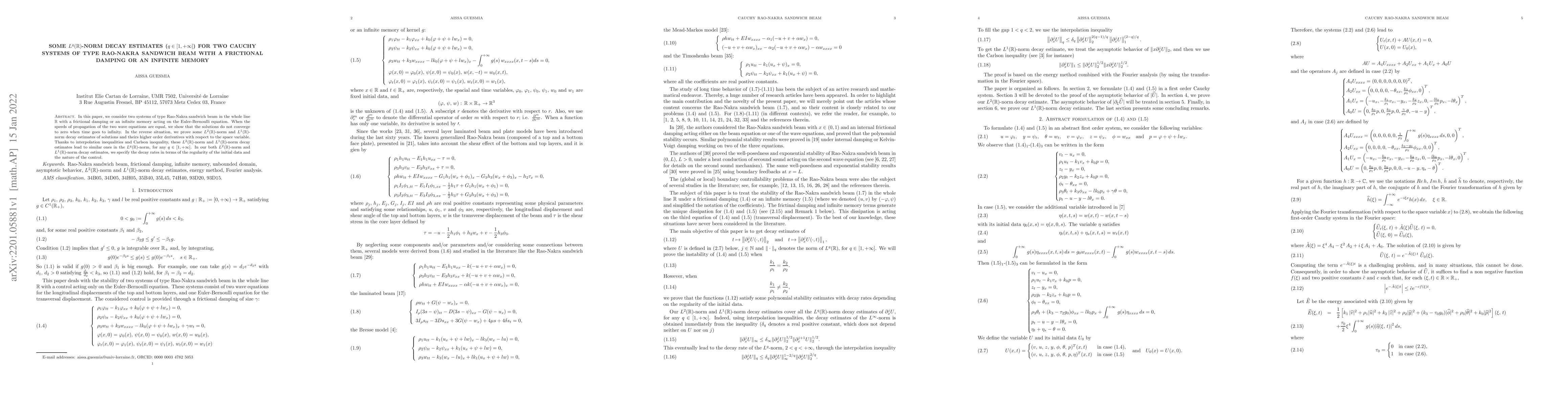 This paper examines Cauchy systems of Rao-Nakra sandwich beams with frictional damping or infinite memory, showing solutions don't vanish over time when wave speeds are equal. For unequal speeds, it provides L2(R)-norm and L1(R)-norm decay estimates for solutions and their derivatives, extendable to Lq(R)-norm for q>1, specifying decay rates based on initial data regularity and control nature.