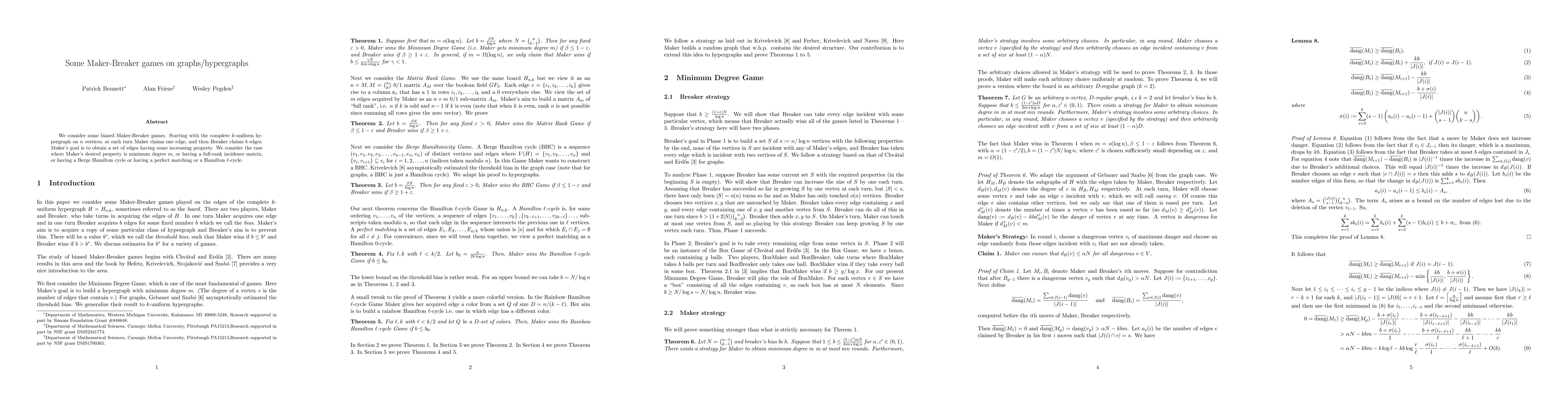 We consider some biased Maker-Breaker games. Starting with the complete $k$-uniform hypergraph on $n$ vertices, at each turn Maker claims one edge, and then Breaker claims $b$ edges. Maker's goal is to obtain a set of edges having some increasing property. We consider the case where Maker's desired property is minimum degree $m$, or having a full-rank incidence matrix, or having a Berge Hamilton cycle or having a perfect matching or a Hamilton $\ell$-cycle.