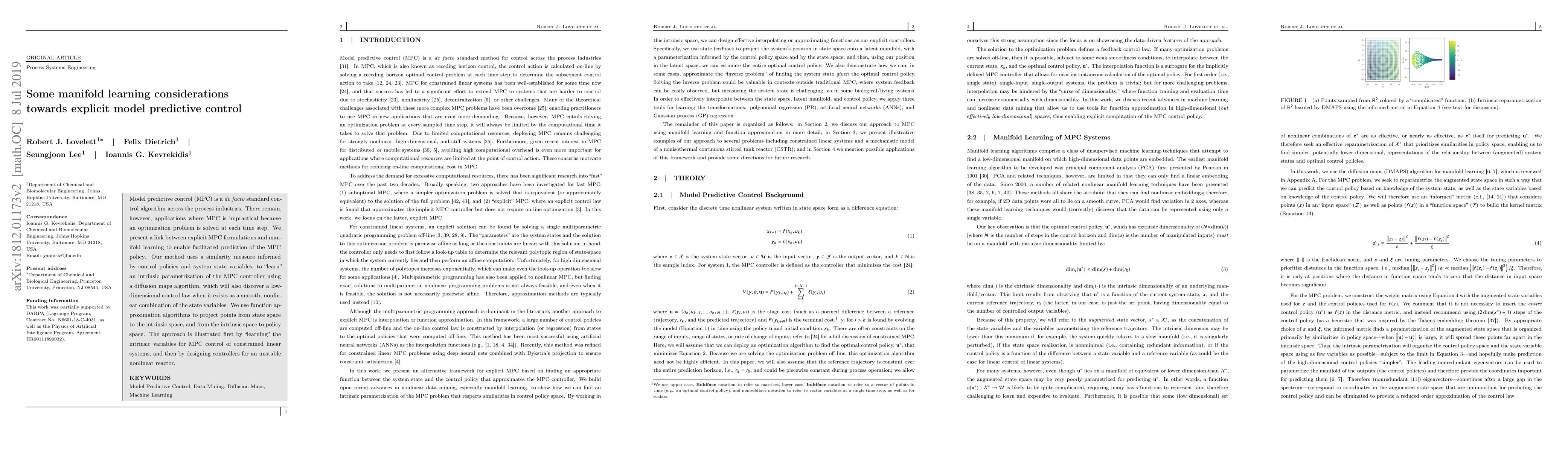 This paper proposes a method linking explicit model predictive control (MPC) with manifold learning to simplify MPC policy prediction. It employs diffusion maps to discover low-dimensional control laws and uses function approximation to map state space to intrinsic and policy spaces, demonstrated on linear and nonlinear systems.