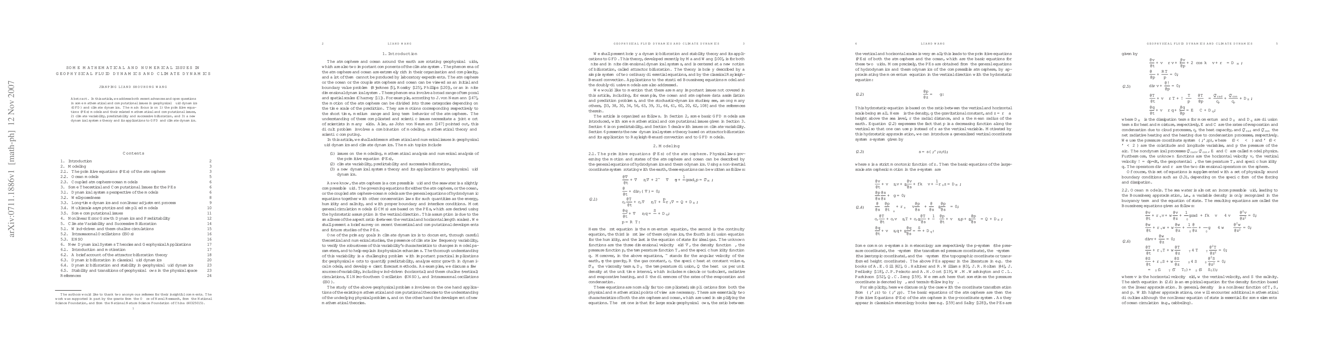 This paper explores recent advances and unresolved issues in mathematical and computational aspects of geophysical fluid dynamics and climate dynamics, focusing on primitive equations models, climate variability and predictability, and the application of a new dynamical systems theory. It aims to address both theoretical and practical challenges in these fields.