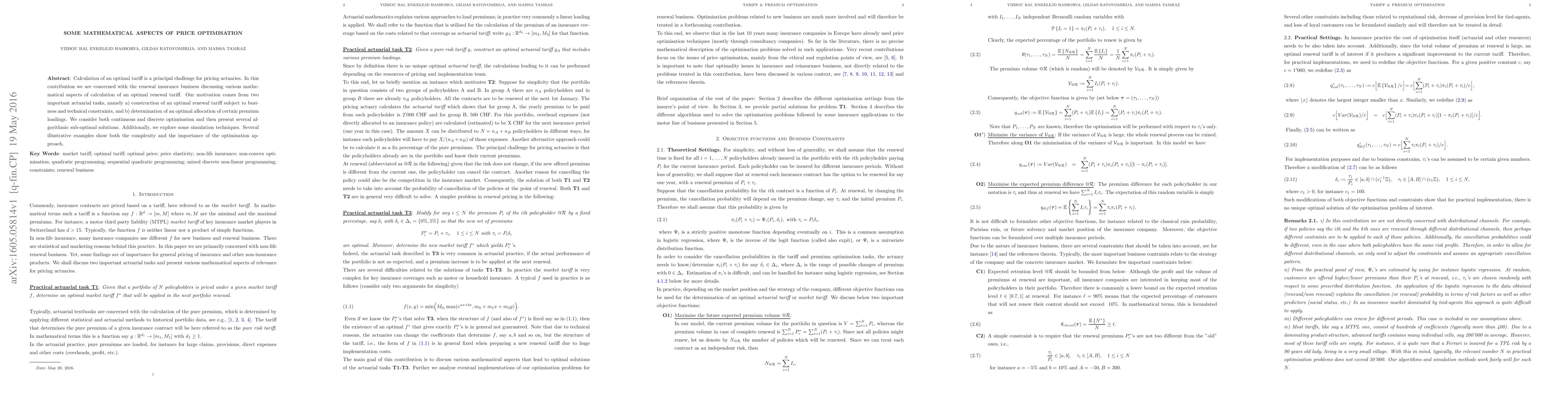 Calculation of an optimal tariff is a principal challenge for pricing actuaries. In this contribution we are concerned with the renewal insurance business discussing various mathematical aspects of calculation of an optimal renewal tariff. Our motivation comes from two important actuarial tasks, namely a) construction of an optimal renewal tariff subject to business and technical constraints, and b) determination of an optimal allocation of certain premium loadings. We consider both continuous and discrete optimisation and then present several algorithmic sub-optimal solutions. Additionally, we explore some simulation techniques. Several illustrative examples show both the complexity and the importance of the optimisation approach.
