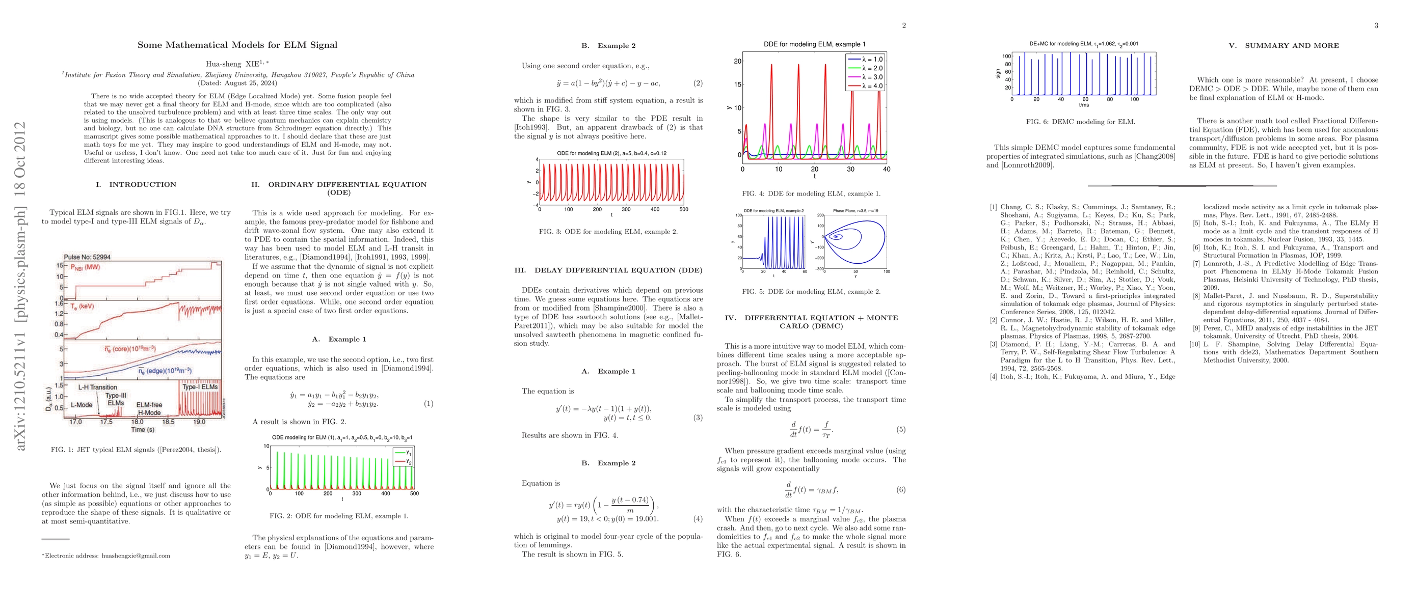 There is no wide accepted theory for ELM (Edge Localized Mode) yet. Some fusion people feel that we may never get a final theory for ELM and H-mode, since which are too complicated (also related to the unsolved turbulence problem) and with at least three time scales. The only way out is using models. (This is analogous to that we believe quantum mechanics can explain chemistry and biology, but no one can calculate DNA structure from Schrodinger equation directly.) This manuscript gives some possible mathematical approaches to it. I should declare that these are just math toys for me yet. They may inspire to good understandings of ELM and H-mode, may not. Useful or useless, I don't know. One need not take too much care of it. Just for fun and enjoying different interesting ideas.