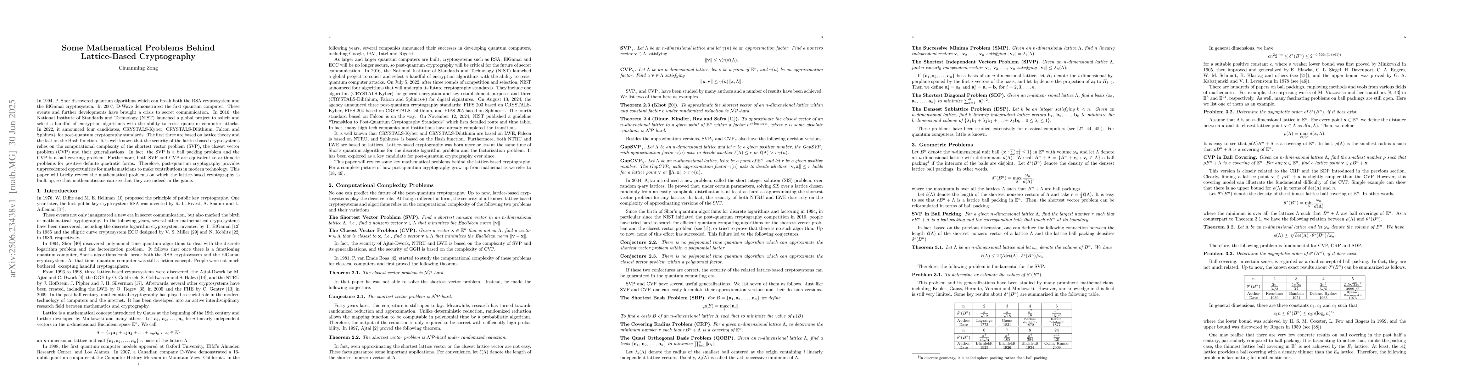 In 1994, P. Shor discovered quantum algorithms which can break both the RSA cryptosystem and the ElGamal cryptosystem. In 2007, D-Wave demonstrated the first quantum computer. These events and further developments have brought a crisis to secret communication. In 2016, the National Institute of Standards and Technology (NIST) launched a global project to solicit and select a handful of encryption algorithms with the ability to resist quantum computer attacks. In 2022, it announced four candidates, CRYSTALS-Kyber, CRYSTALS-Dilithium, Falcon and Sphincs$+$ for post-quantum cryptography standards. The first three are based on lattice theory and the last on the Hash function. It is well known that the security of the lattice-based cryptosystems relies on the computational complexity of the shortest vector problem (SVP), the closest vector problem (CVP) and their generalizations. In fact, the SVP is a ball packing problem and the CVP is a ball covering problem. Furthermore, both SVP and CVP are equivalent to arithmetic problems for positive definite quadratic forms. Therefore, post-quantum cryptography provides unprecedented opportunities for mathematicians to make contributions in modern technology. This paper will briefly review the mathematical problems on which the lattice-based cryptography is built up, so that mathematicians can see that they are indeed in the game.