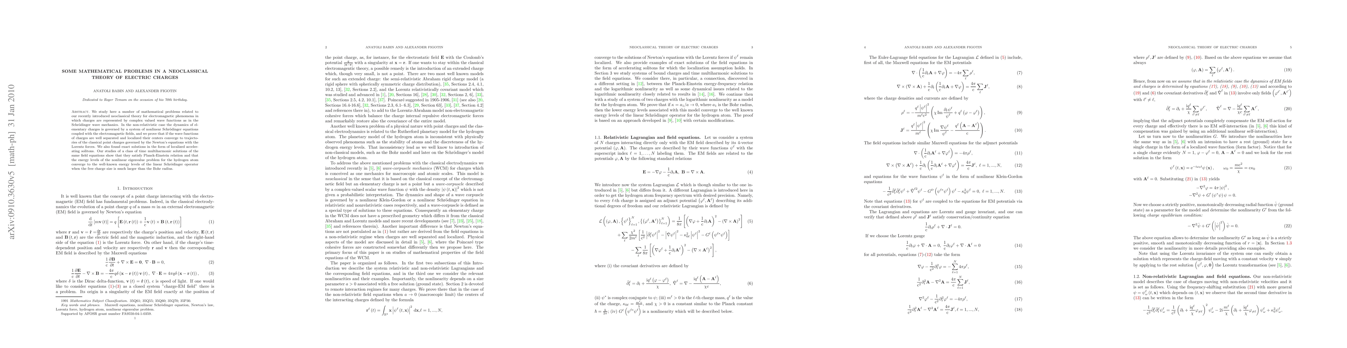 We study here a number of mathematical problems related to our recently introduced neoclassical theory for the electromagnetic phenomena in which charges are represented by complex valued wave functions as in the Schrodinger wave mechanics. Dynamics of charges in the non-relativistic case is governed by a system of nonlinear Schrodinger equations coupled with the electromagnetic fields, and we prove for it that the centers of wave functions converge in macroscopic regimes to trajectories of points governed by the Newton's equations with the Lorentz forces provided the wave functions remain localized. Exact solutions in the form of localized accelerating solitons are found. Our studies of a class of time multiharmonic solutions of the same field equations show that they satisfy Planck-Einstein relation and that the energy levels of the nonlinear eigenvalue problem for the hydrogen atom converge to the well-known energy levels of the linear Schrodinger operator when the free charge size is much larger than the Bohr radius.