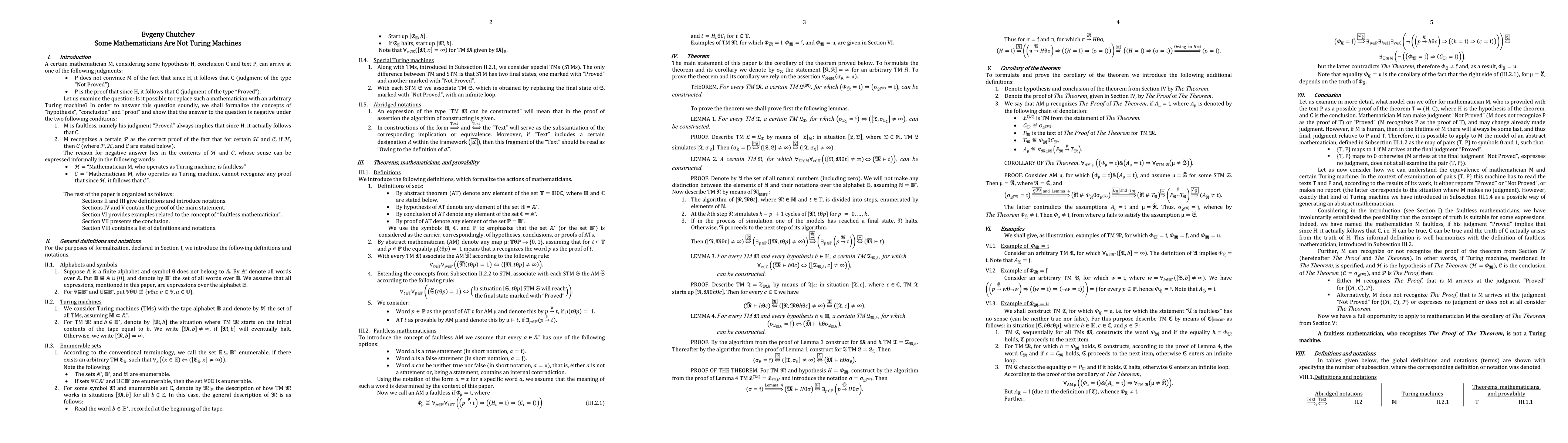A certain mathematician M, considering some hypothesis H, conclusion C and text P, can arrive at one of the following judgments: (1) P does not convince M of the fact that since H, it follows that C; (2) P is the proof that since H, it follows that C (judgment of the type "Proved"). Is it possible to replace such a mathematician with an arbitrary Turing machine? The paper provides a proof that the answer to the question is negative under the two following conditions: (1) M is faultless, namely his judgment "Proved" always implies that since H, it actually follows that C; (2) M recognizes a certain P' as the correct proof of the fact that for certain H' and C', if H', then C' (where P', H', and C' are stated in the paper).