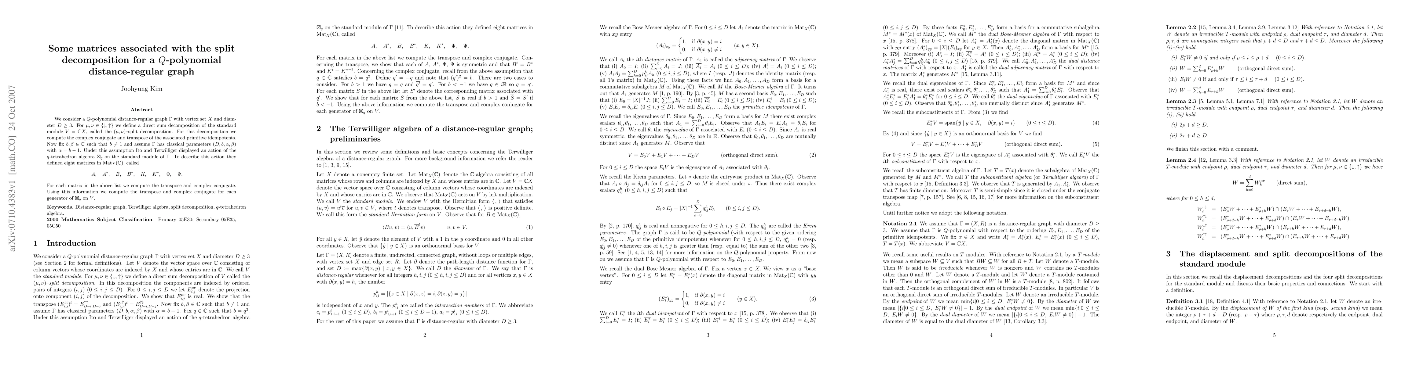 This paper investigates the split decomposition of the standard module for a $Q$-polynomial distance-regular graph, focusing on the $(\mu,\nu)$-split decomposition. It computes the transpose and complex conjugate of associated primitive idempotents and matrices defined by Ito and Terwilliger to describe the action of the $q$-tetrahedron algebra on the graph's standard module.