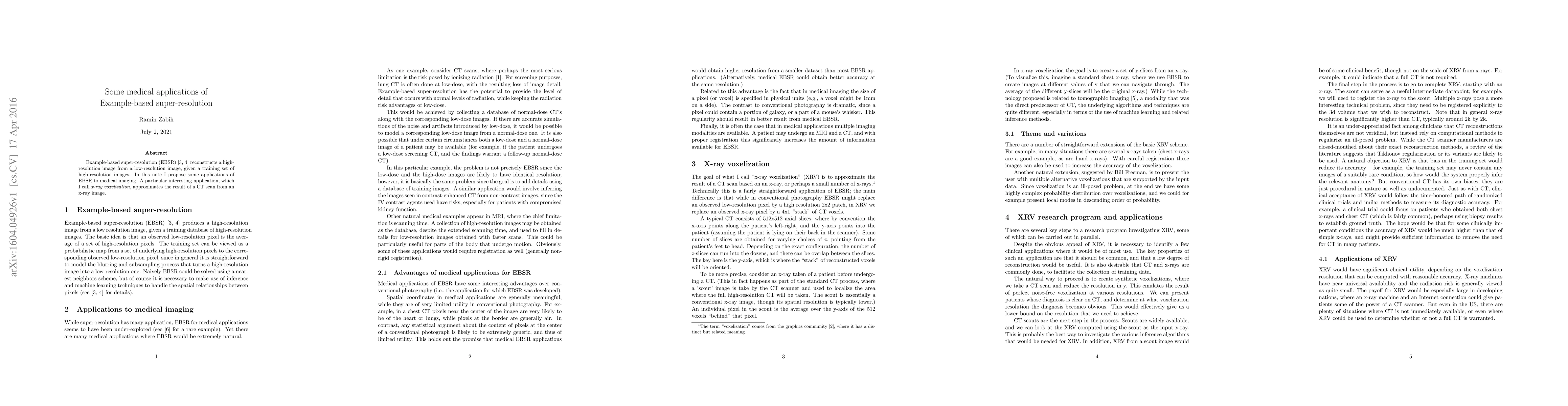 This paper explores the application of example-based super-resolution (EBSR) in medical imaging, particularly introducing "x-ray voxelization" to approximate CT scan results from x-ray images, demonstrating potential advancements in medical diagnostic imaging.