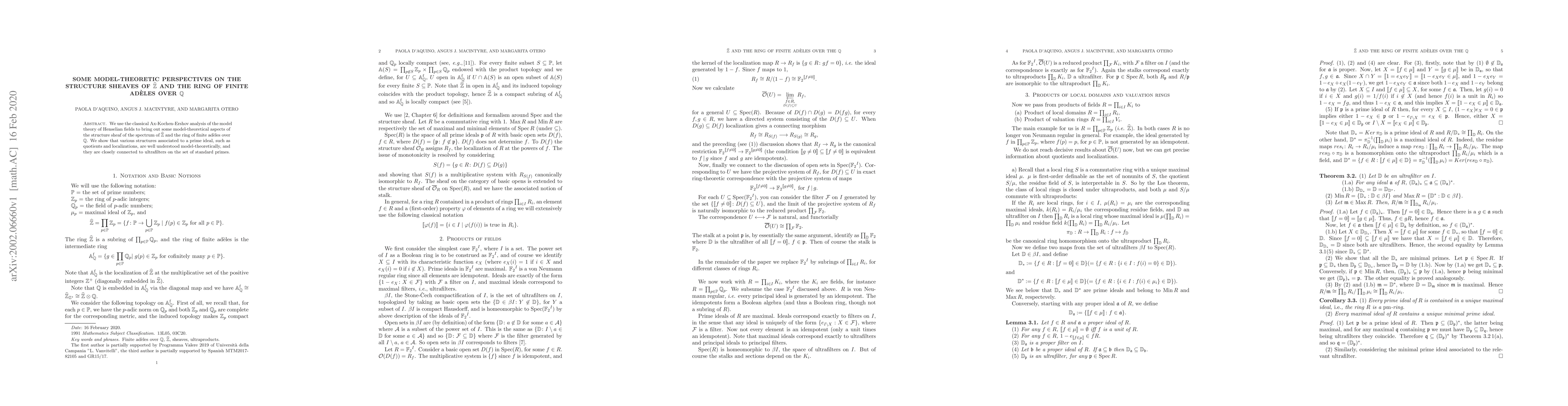 Researchers apply model theory to understand the structure sheaves of Z^'s spectrum and the ring of finite ad extit{e}les over Q, revealing connections between prime ideals and ultrafilters on standard primes.