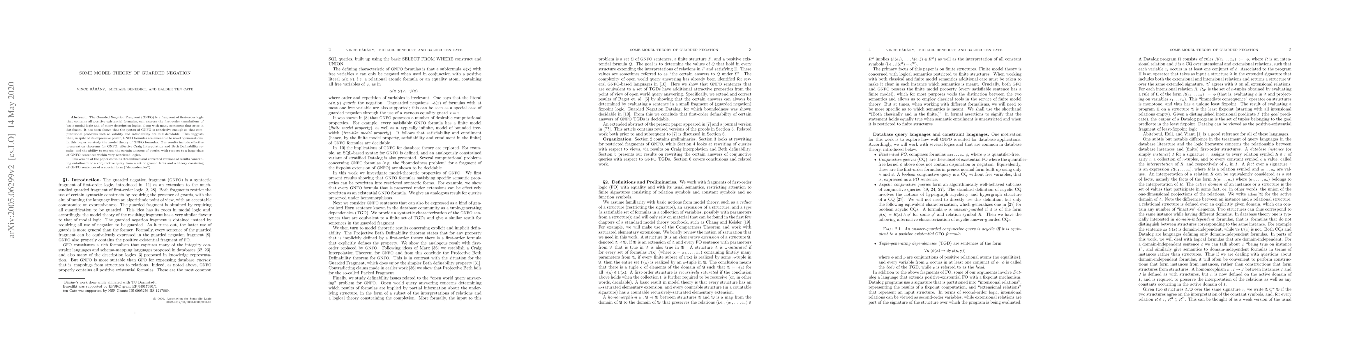 The Guarded Negation Fragment (GNFO) is a fragment of first-order logic that contains all positive existential formulas, can express the first-order translations of basic modal logic and of many description logics, along with many sentences that arise in databases. It has been shown that the syntax of GNFO is restrictive enough so that computational problems such as validity and satisfiability are still decidable. This suggests that, in spite of its expressive power, GNFO formulas are amenable to novel optimizations. In this paper we study the model theory of GNFO formulas. Our results include effective preservation theorems for GNFO, effective Craig Interpolation and Beth Definability results, and the ability to express the certain answers of queries with respect to a large class of GNFO sentences within very restricted logics. This version of the paper contains streamlined and corrected versions of results concerning entailment of a conjunctive query from a set of ground facts and a theory consisting of GNFO sentences of a special form ("dependencies").