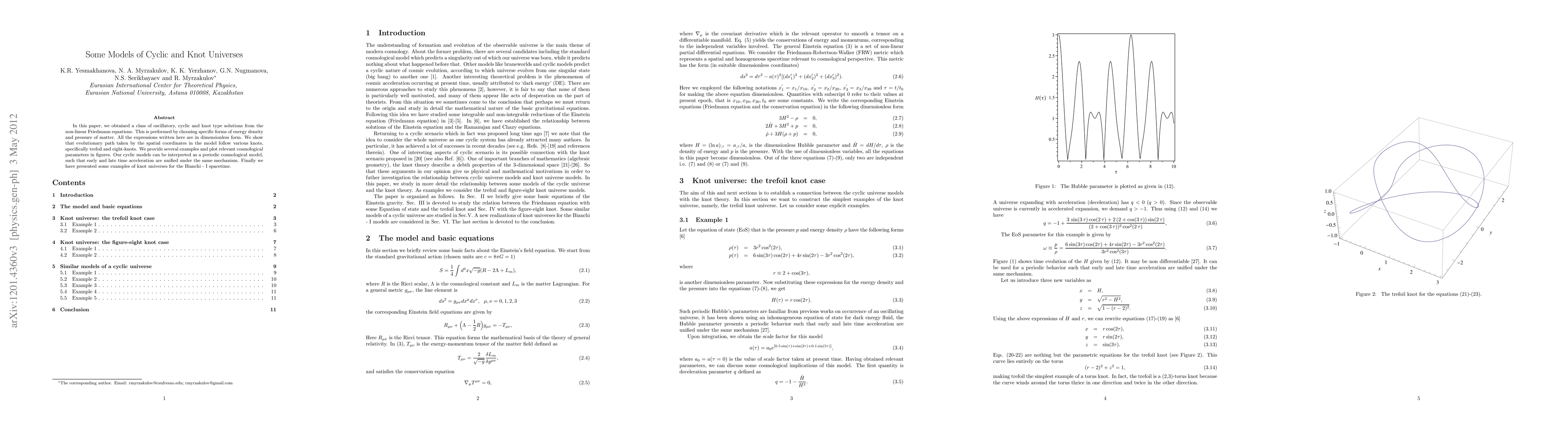In this paper, we obtained a class of oscillatory, cyclic and knot type solutions from the non-linear Friedmann equations. This is performed by choosing specific forms of energy density and pressure of matter. All the expressions written here are in dimensionless form. We show that evolutionary path taken by the spatial coordinates in the model follow various knots, specifically trefoil and eight-knots. We provide several examples and plot relevant cosmological parameters in figures. Our cyclic models can be interpreted as a periodic cosmological model, such that early and late time acceleration are unified under the same mechanism.