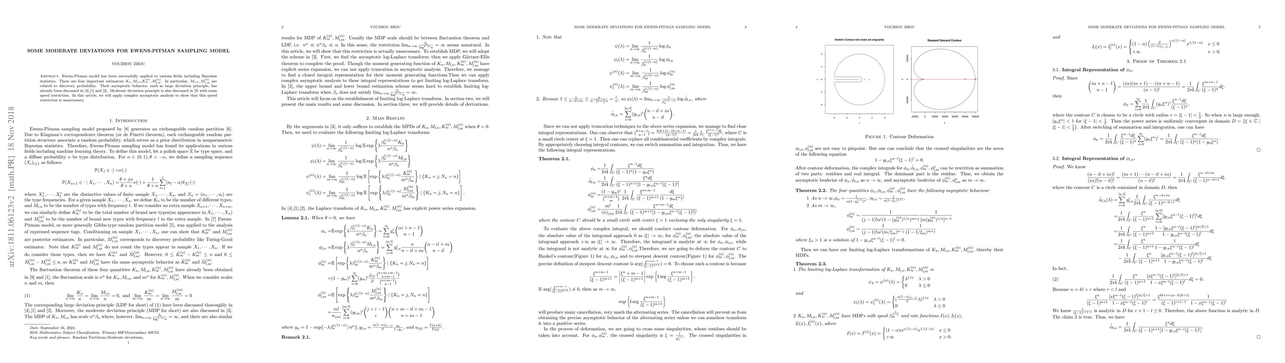 Ewens-Pitman model has been successfully applied to various fields including Bayesian statistics. There are four important estimators $K_{n},M_{l,n}$,$K_{m}^{(n)},M_{l,m}^{(n)}$. In particular, $M_{1,n}, M_{1,m}^{(n)}$ are related to discovery probability. Their asymptotic behavior, such as large deviation principle, has already been discussed in [4],[1] and [2]. Moderate deviation principle is also discussed in [3] with some speed restriction. In this article, we will apply complex asymptotic analysis to show that this speed restriction is unnecessary.