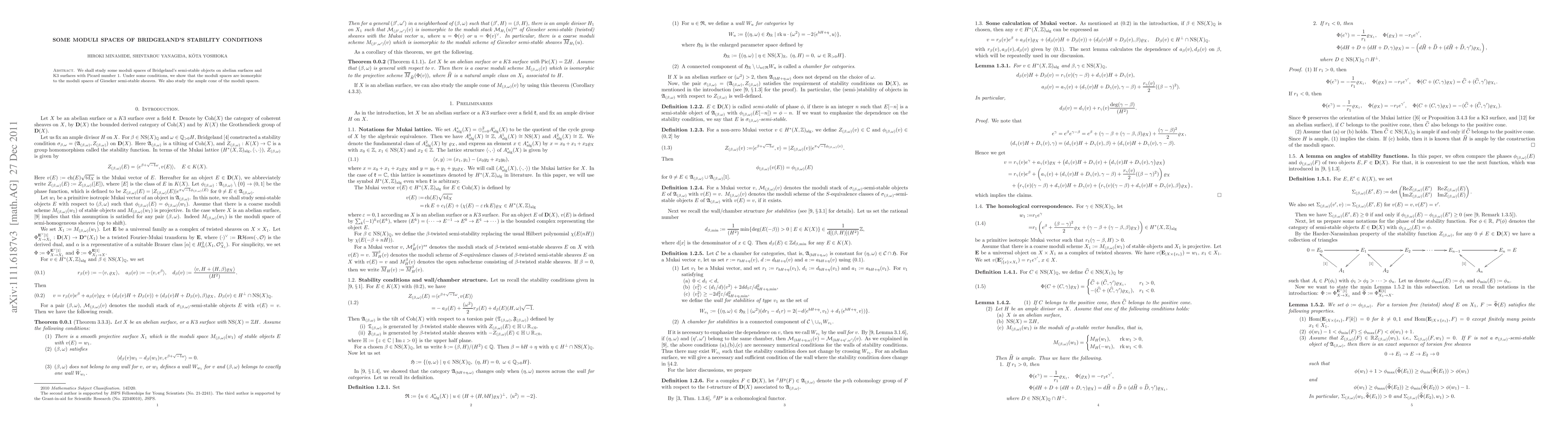 This paper investigates moduli spaces of Bridgeland's semi-stable objects on abelian and K3 surfaces with Picard number 1, demonstrating their isomorphism to moduli spaces of Gieseker semi-stable sheaves under certain conditions, and examines the ample cone of these moduli spaces.