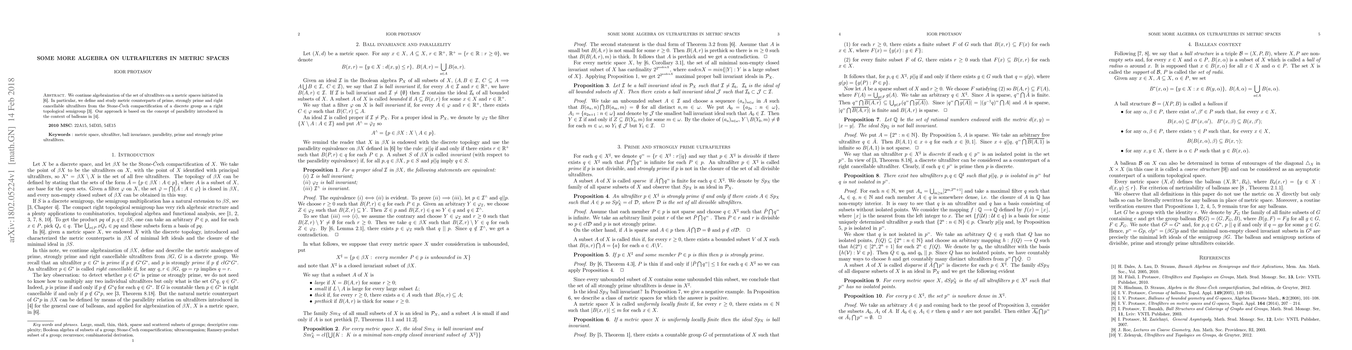 This paper further develops the algebraization of ultrafilters in metric spaces, defining metric versions of prime, strongly prime, and right cancellable ultrafilters. It utilizes the concept of parallelity from balleans to extend the Stone-Čech compactification framework for discrete groups.