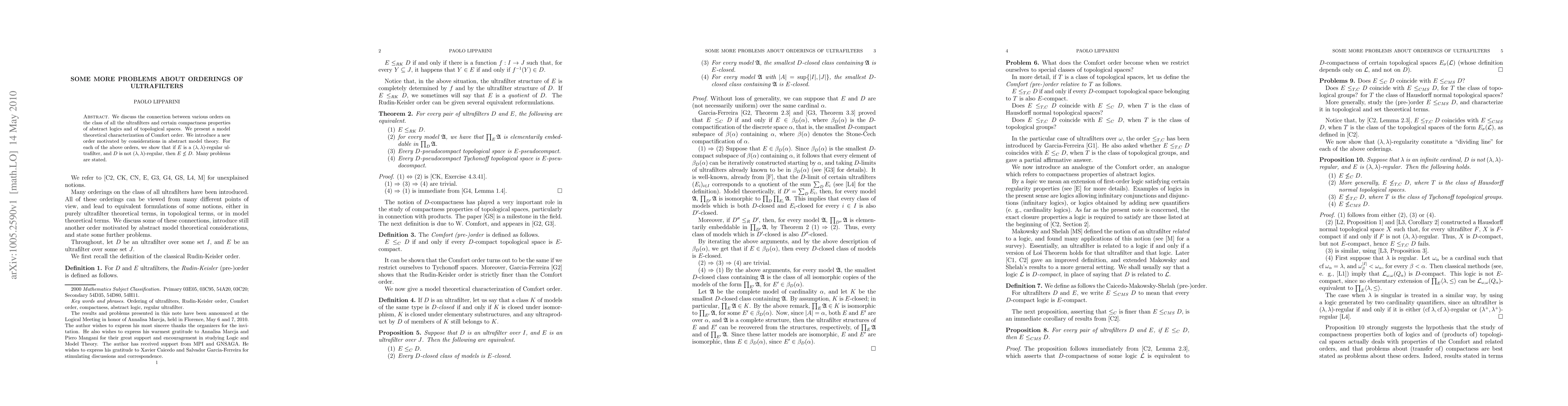 We discuss the connection between various orders on the class of all the ultrafilters and certain compactness properties of abstract logics and of topological spaces. We present a model theoretical characterization of Comfort order. We introduce a new order motivated by considerations in abstract model theory. For each of the above orders, we show that if $E$ is a $(\lambda, \lambda)$-regular ultrafilter, and $D$ is not $(\lambda, \lambda)$-regular, then $E \not \leq D$. Many problems are stated.