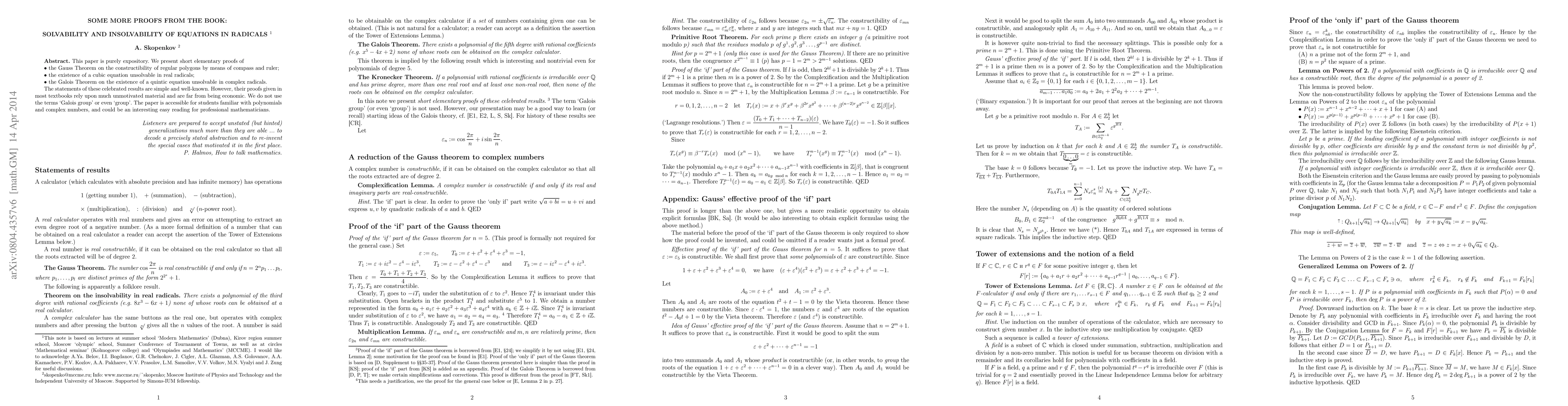 This paper is purely expository. We present short elementary proofs of * the Gauss Theorem on constructibility of regular polygons; * the existence of a cubic equation unsolvable in real radicals; * the existence of a quintic equation unsolvable in complex radicals (Galois Theorem). The statements of these celebrated results are simple and well-known. However, their proofs given in most textbooks rely upon much unmotivated material and are far from being economic. We do not use the terms `Galois group' or even `group'. The paper is accessible for students familiar with polynomials and complex numbers, and could be an interesting easy reading for professional mathematicians. Short English version is followed by an extended Russian version where before presenting the proofs we illustrate the main ideas by sequences of problems with hints or solutions.