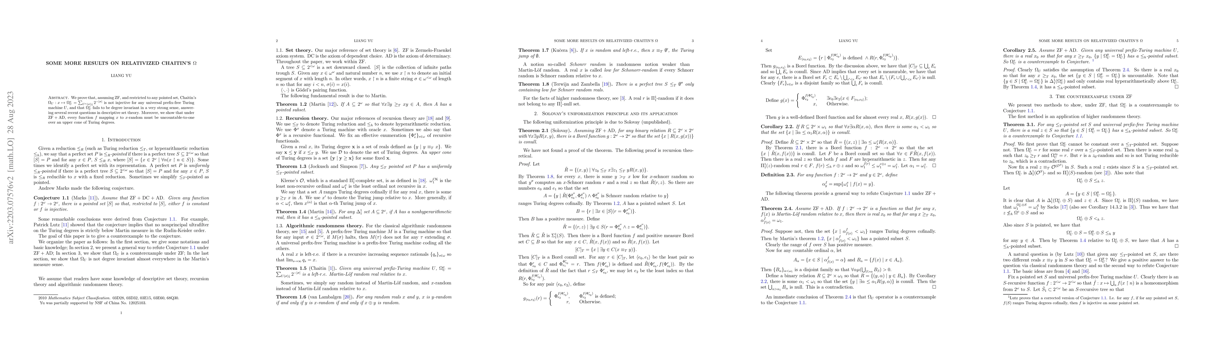 This paper proves that Chaitin's $\Omega_U$ is not injective under $\mathrm{ZF}$ and lacks degree invariance, addressing questions in descriptive set theory. It also demonstrates that under $\mathrm{ZF}+\mathrm{AD}$, every $x$-random function must be uncountably surjective over an upper cone of Turing degrees.