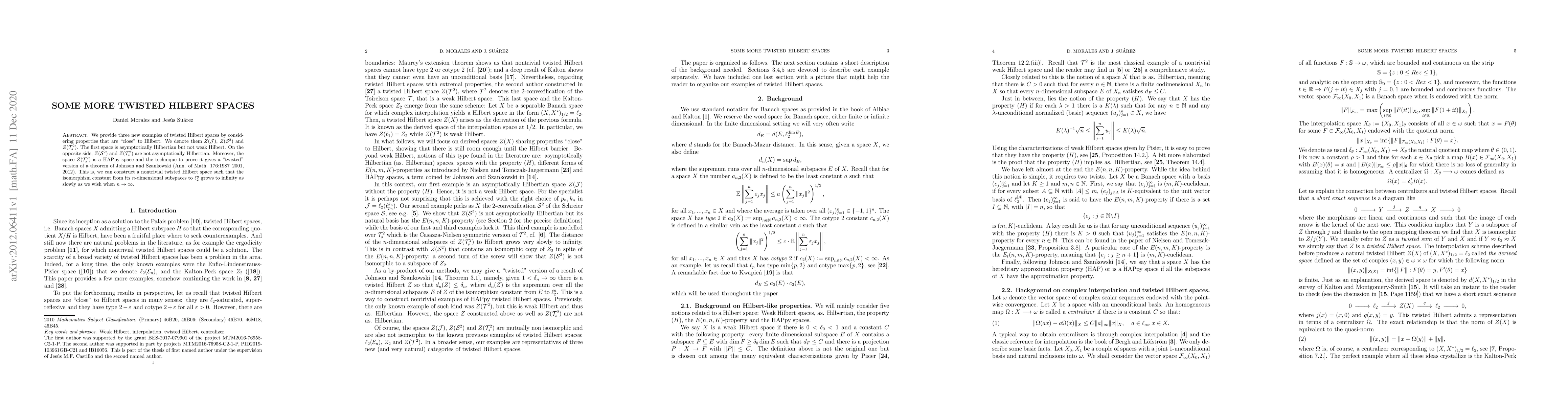 This paper introduces three new examples of twisted Hilbert spaces denoted as $Z(\mathcal J)$, $Z(\mathcal S^2)$, and $Z(\mathcal T_s^2)$, exploring properties that are close to those of Hilbert spaces. The space $Z(\mathcal T_s^2)$ is a HAPpy space and demonstrates a "twisted" version of a theorem by Johnson and Szankowski, allowing for the construction of nontrivial spaces with slowly growing isomorphism constants.