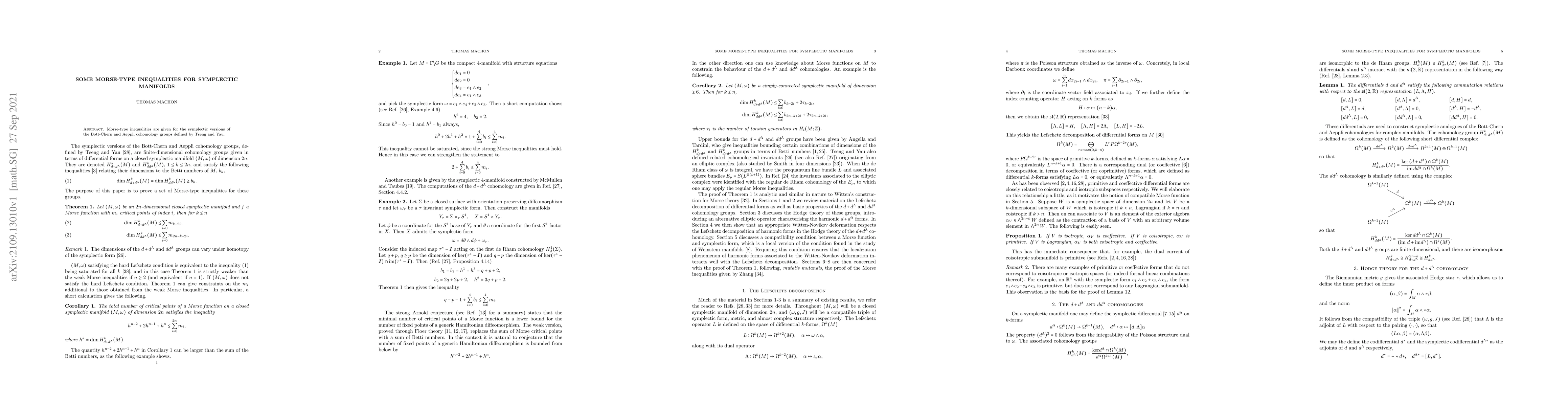 The paper establishes Morse-type inequalities for symplectic versions of Bott-Chern and Aeppli cohomology groups on symplectic manifolds, extending classical Morse theory to this setting. These inequalities provide insights into the relationship between the topology of symplectic manifolds and their cohomology.