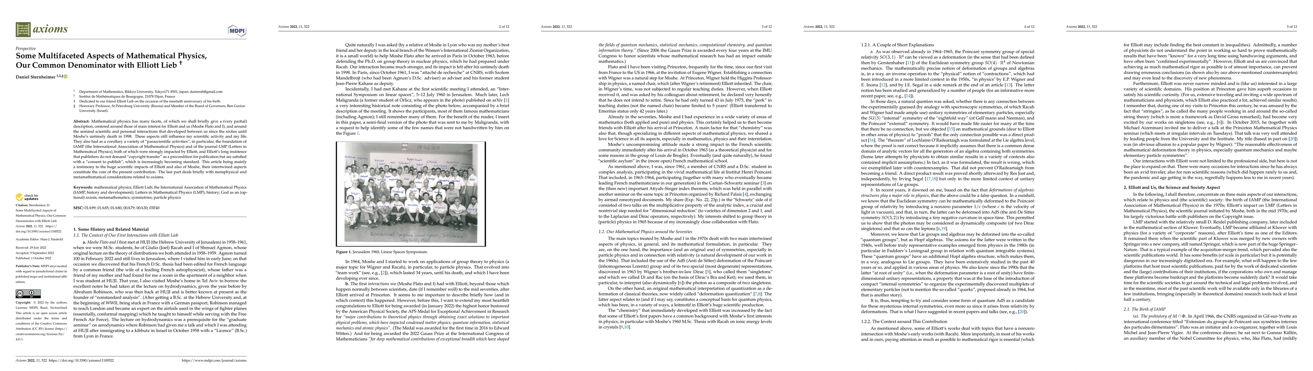 This paper discusses the multifaceted aspects of mathematical physics, focusing on the contributions of Elliott Lieb, and highlights the significant roles played by the authors in founding the International Association of Mathematical Physics and its journal. It also emphasizes Lieb's advocacy for fair publication practices and touches on metaphysical and metamathematical considerations.